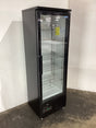 Upright Fridge. Features 1 Glass Door, 307L Capacity, Internal Lighting, Digital Temp Controls, Range 2°C to 8°C, 4 Shelves, On Rollers, Climate Class Normal, Black Finish, Surface Scratches, 10 Amp 1 Phase, 605mmW x 555mmD x 1880mmH, 98KG