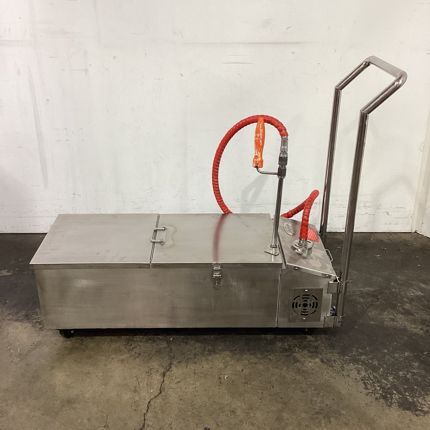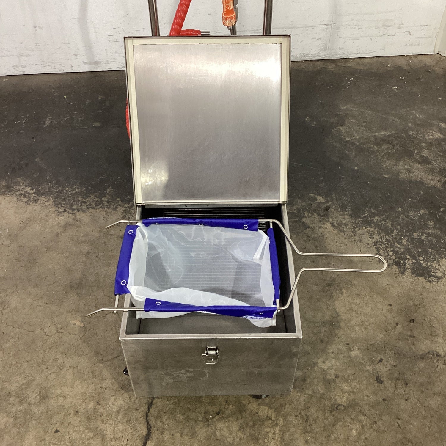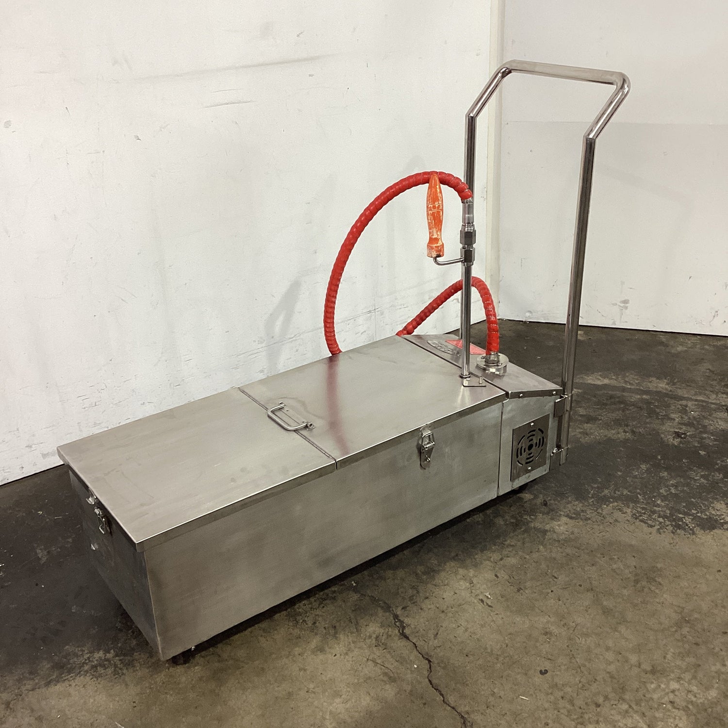 Oil Filter. Features 10 litres per minute, 150C, 40L filter capacity, Using temp 150-200C, Castors, Stainless steel finish, Scratches, 10 amp 1 phase, 350mmW x 960mmD x 880mmH, 25KG