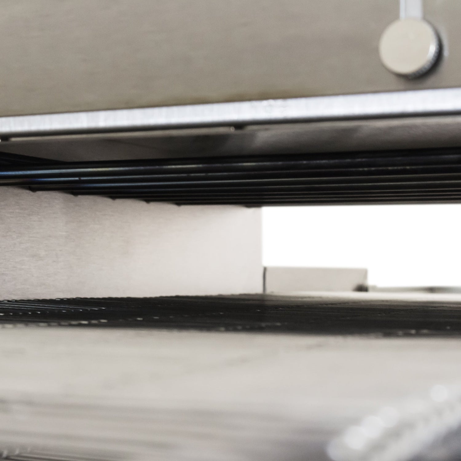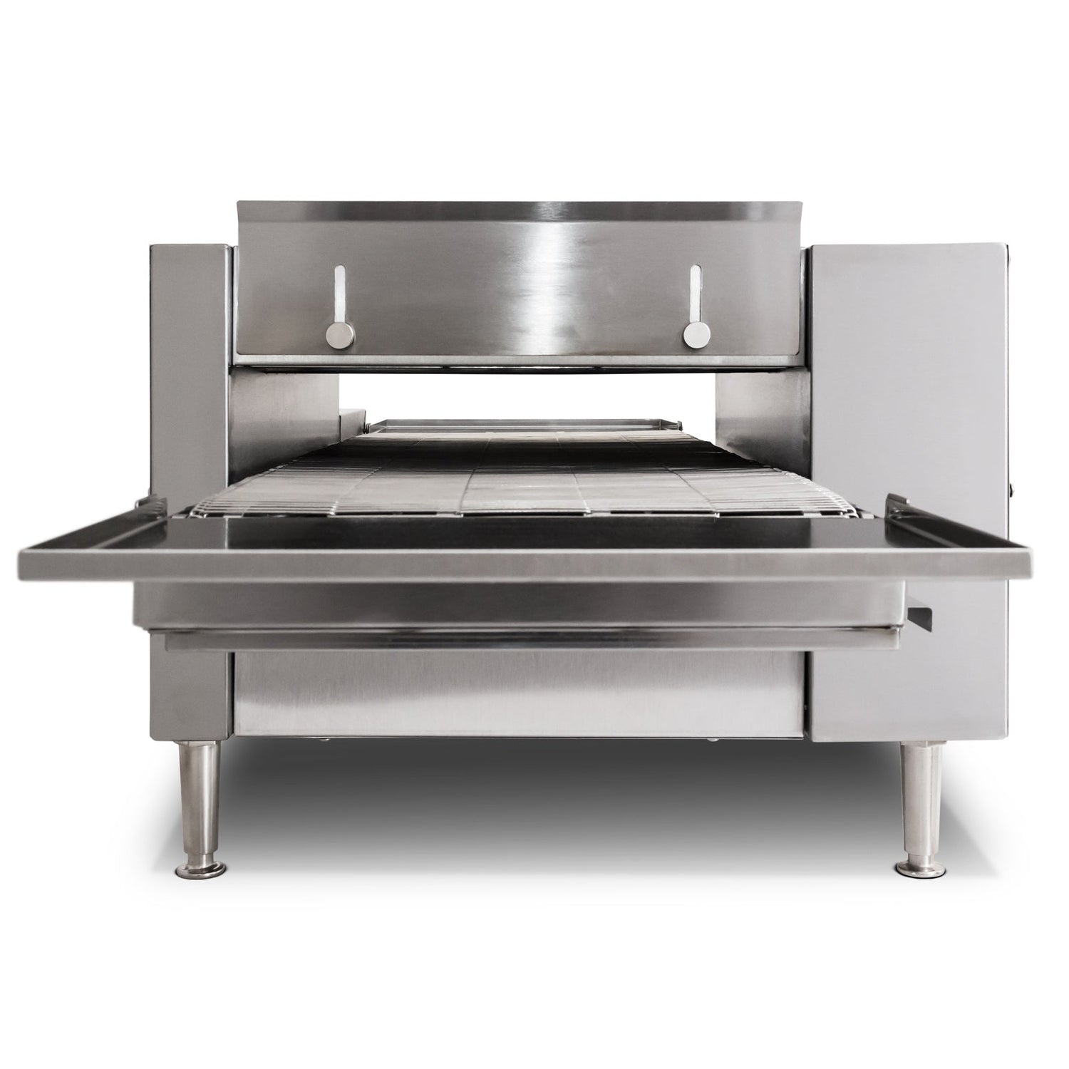 For your convenience, this oven can reverse conveyor direction. This conveyor oven features a long-lasting ceramic heating system in the top of the unit, the design of the heating elements provides a cool touch exterior, which helps prevent burns and other accidents. This pass-through conveyor oven is CE approved.