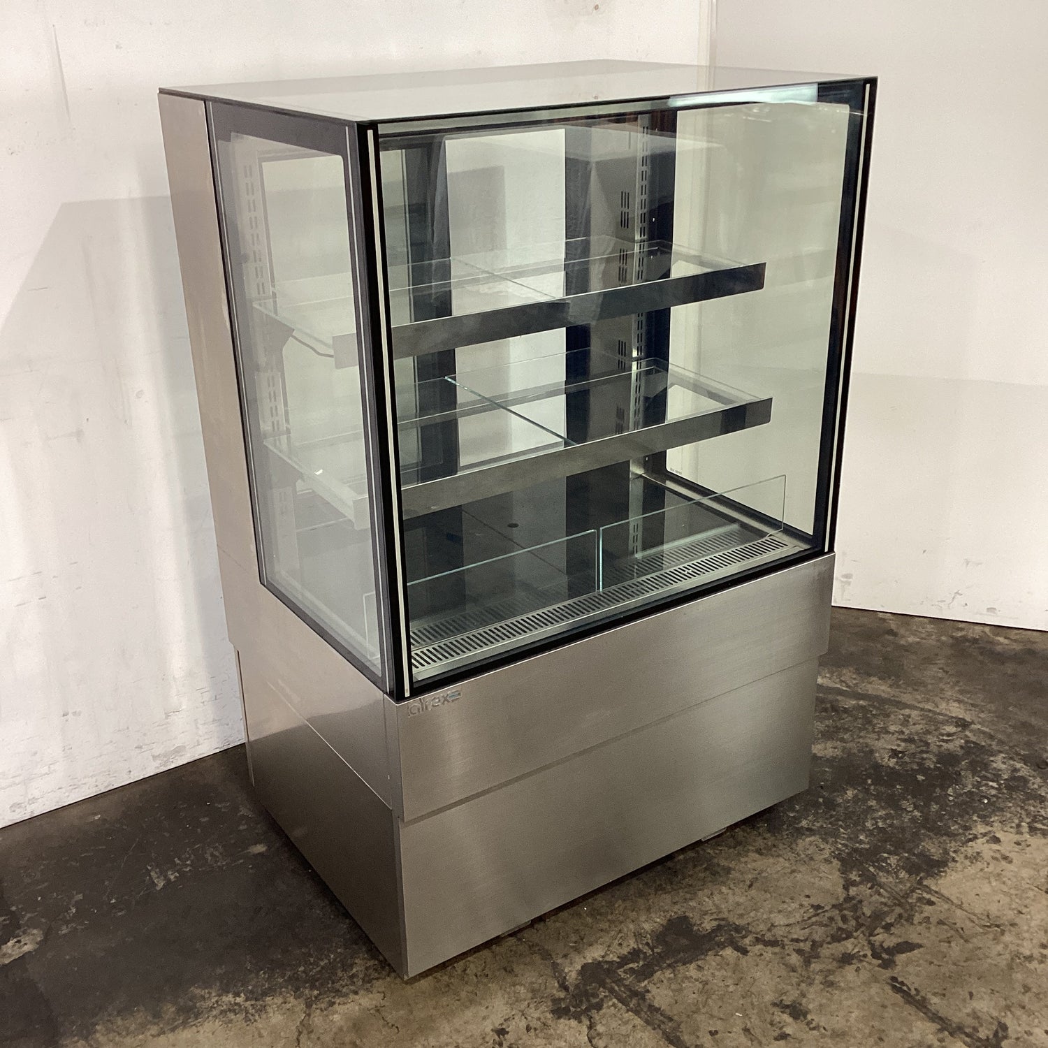 Square Glass Refrigerated Display. Features square glass, 2 shelves, Internal lighting, 2 sliding glass doors, Digital temp controls 2°C to 5°C, Castors, Climate class normal, S/S finish, Scratches, 10 amp 1 phase, 870mmW x 690mmD x 1350mmH, 172KG