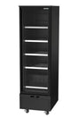 Upright Fridge. Features 1 glass door, 380L capacity, Internal lighting, Digital temp controls 1°C - 5°C, 4 shelves, On castors, Climate class normal, Black finish, Surface scratches, 10 amp 1 phase, 600mmW x 780mmD x 2030mmH, 119KG