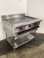 3 Burner Griddle Toaster. Features 45mj/hr, 900mmW flat plate, Removable toasting rack with 2 positions, Drainage well, Fat catcher, Mid shelf, Flame fail valve, External regulator, S/S finish, Surface scratches, LPG, 915mmW x 830mmD x 1000mmH, 129KG