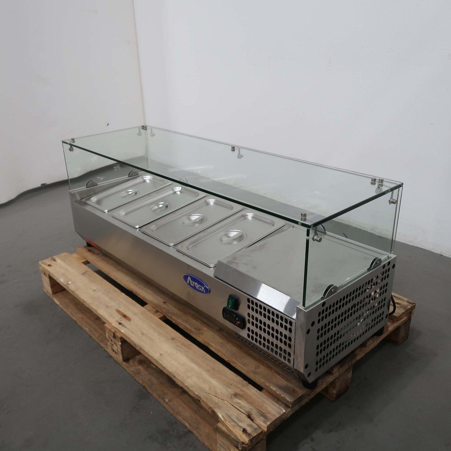 Countertop Salad Bar. Features Square glass canopy, 4 x 1/3 Gn pans plus lids, On feet, Climate class normal, S/S Finish, Scratches & Dents, Static cooling system, Glass sneeze canopy guard structure, Constructed in high-quality stainless-steel exterior & interior, 1210mmW x 400mmD x 450mmH. 41KG. 10 Amp, 1 Phase.