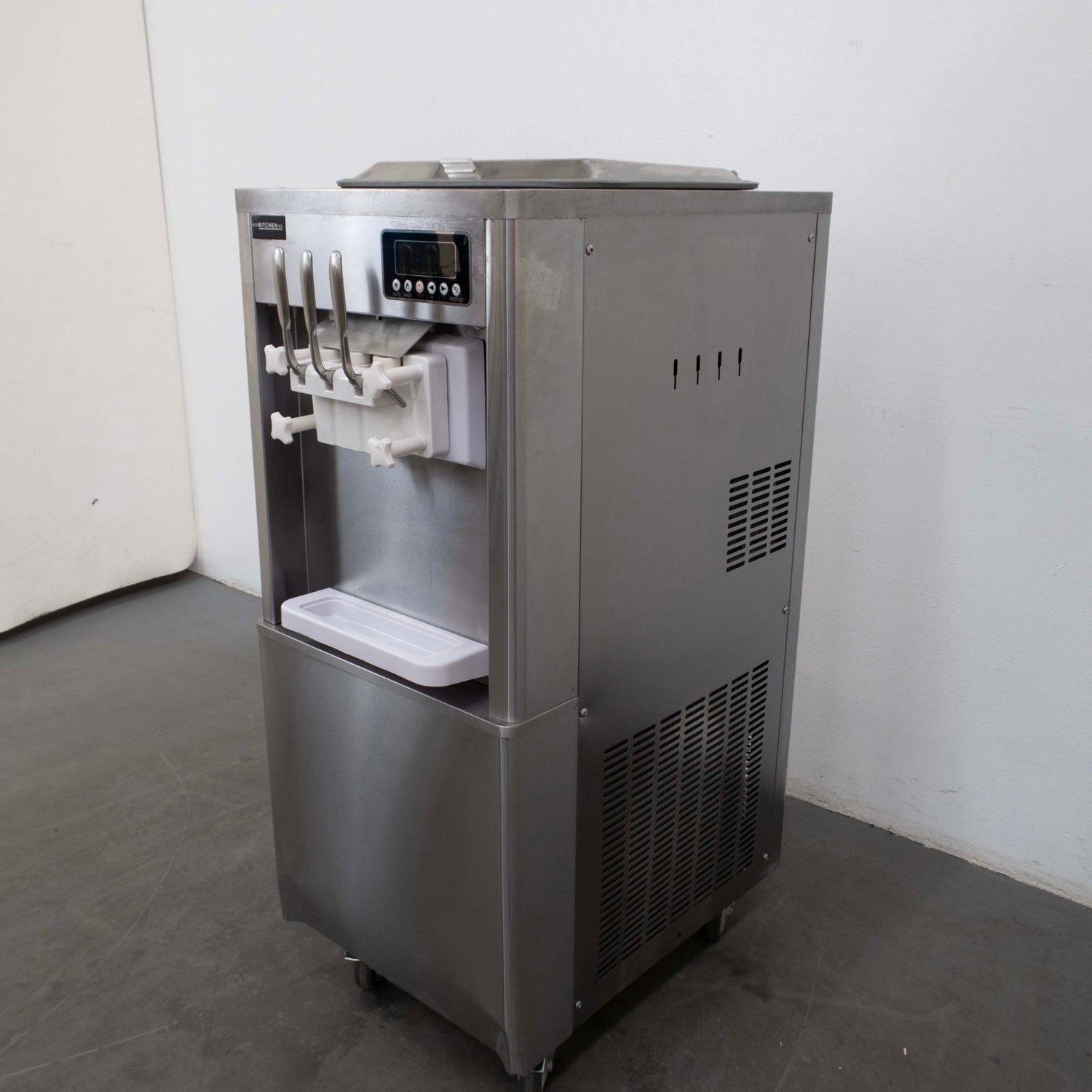 Ice Cream Machine. Features 25 Litre Output, Microprocessor Controls, Produces between 183 - 313 cups per hour (80g serves), Gravity Feed System, On castors, Climate class normal, Adjustable Product Hardness, Temperature Display, S/S Finish, Scratches & Dents, Dispense 2 individual flavours or combine 2 in a rainbow twist for added versatility, 10 Amp 1 Phase, 520mmW x 850mmD x 1300mmH, 135KG