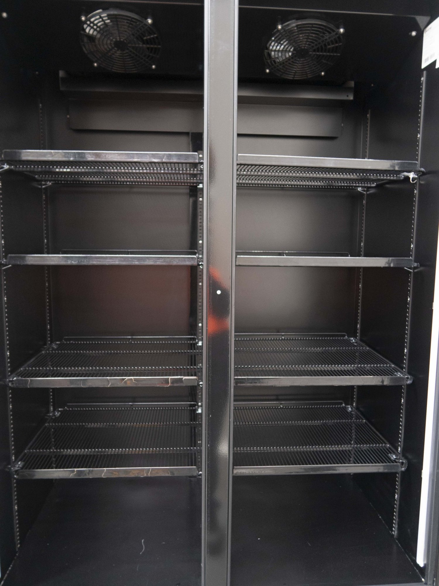 Upright Fridge. Features 2 Glass Door, Bottom mounted motor, Internal LED lighting, Digital temp controls, 8 x Shelves, On castors, Climate class normal, Black, Scratches & Dents, Capacity 1088L, Double glazed door, 10 Amp 1 Phase, 1200mmW x 725mmD x 2175mmH, 188KG