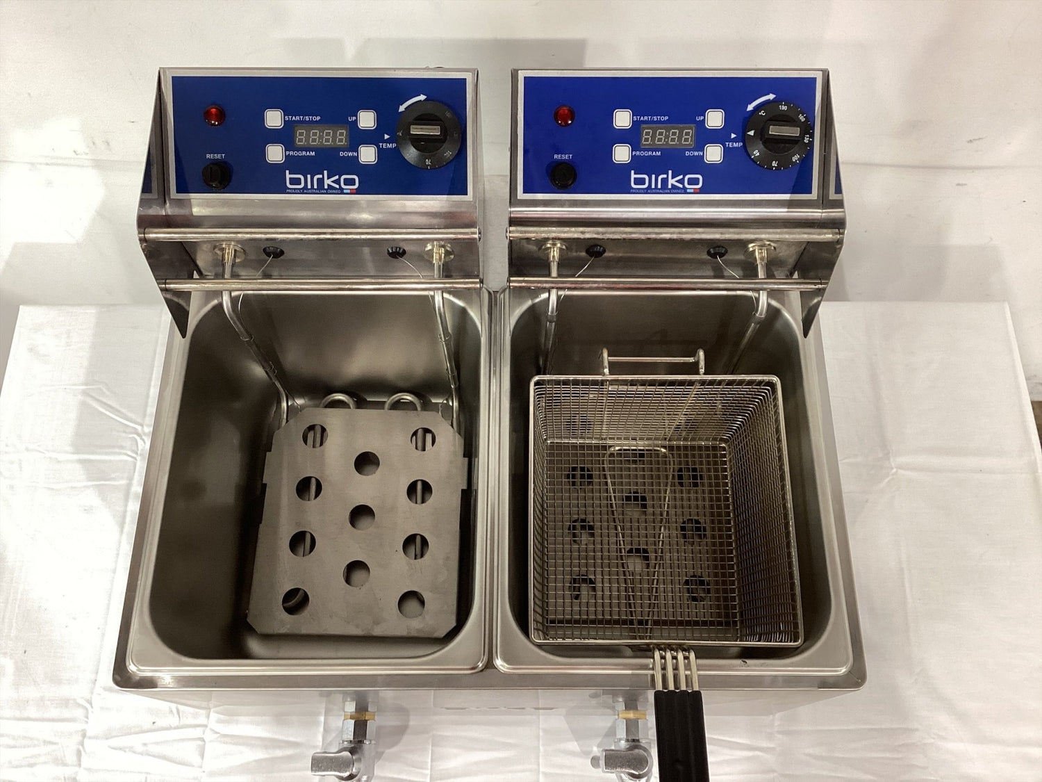 C/Top 2 Pan Fryer. Features 2 pans, 2 baskets, 8L capacity per pan, Basket holder, Fish plates, Drainage spouts, Rubber feet, Night cover, S/S finish, Surface scratches, 2 x 15 amp 1 phase, 550mmW x 660mmD x 450mmH, 16KG