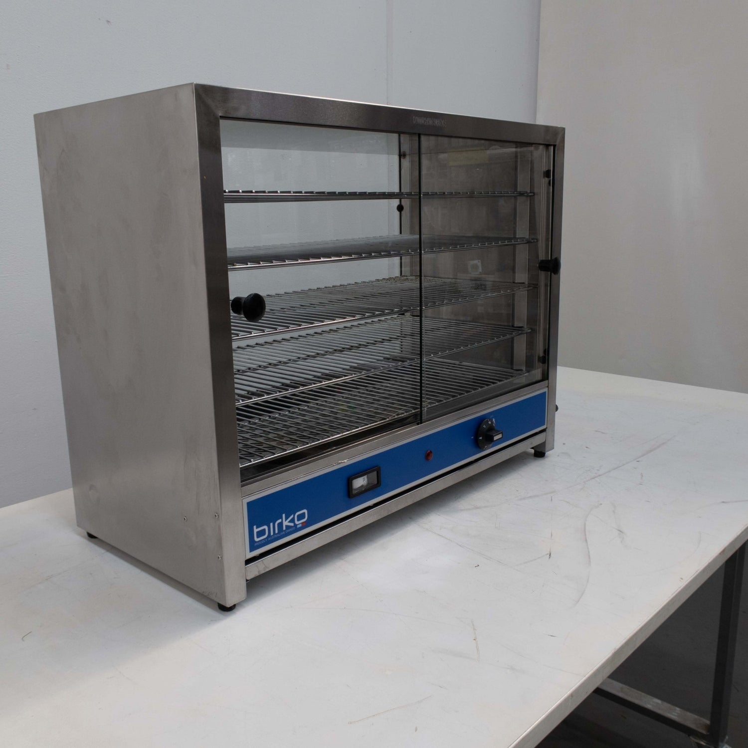 Pie Warmer. Features Capacity 100 pies, Material Stainless Steel and Glass, Five fixed wire shelves, Thermostat and thermometer provide accurate temperature control, Stainless steel construction is highly durable for long-lasting use, Removable glass sliding door, Heat resistant ABS controls, dials and handles, S/S Finish, Scratches & Dents, 10 Amp 1 Phase, 745mmW x 380mmD x 605mmH, 30KG