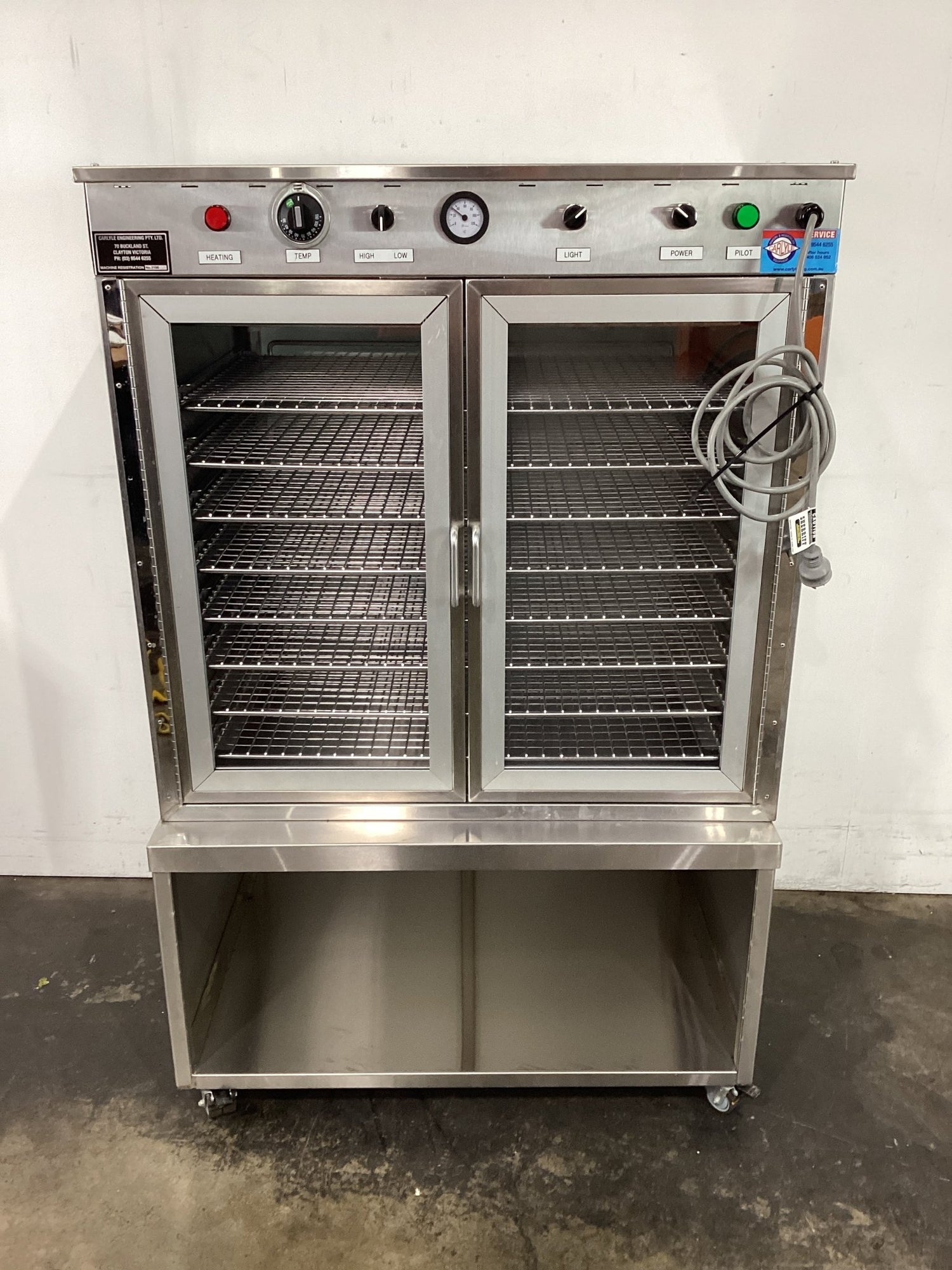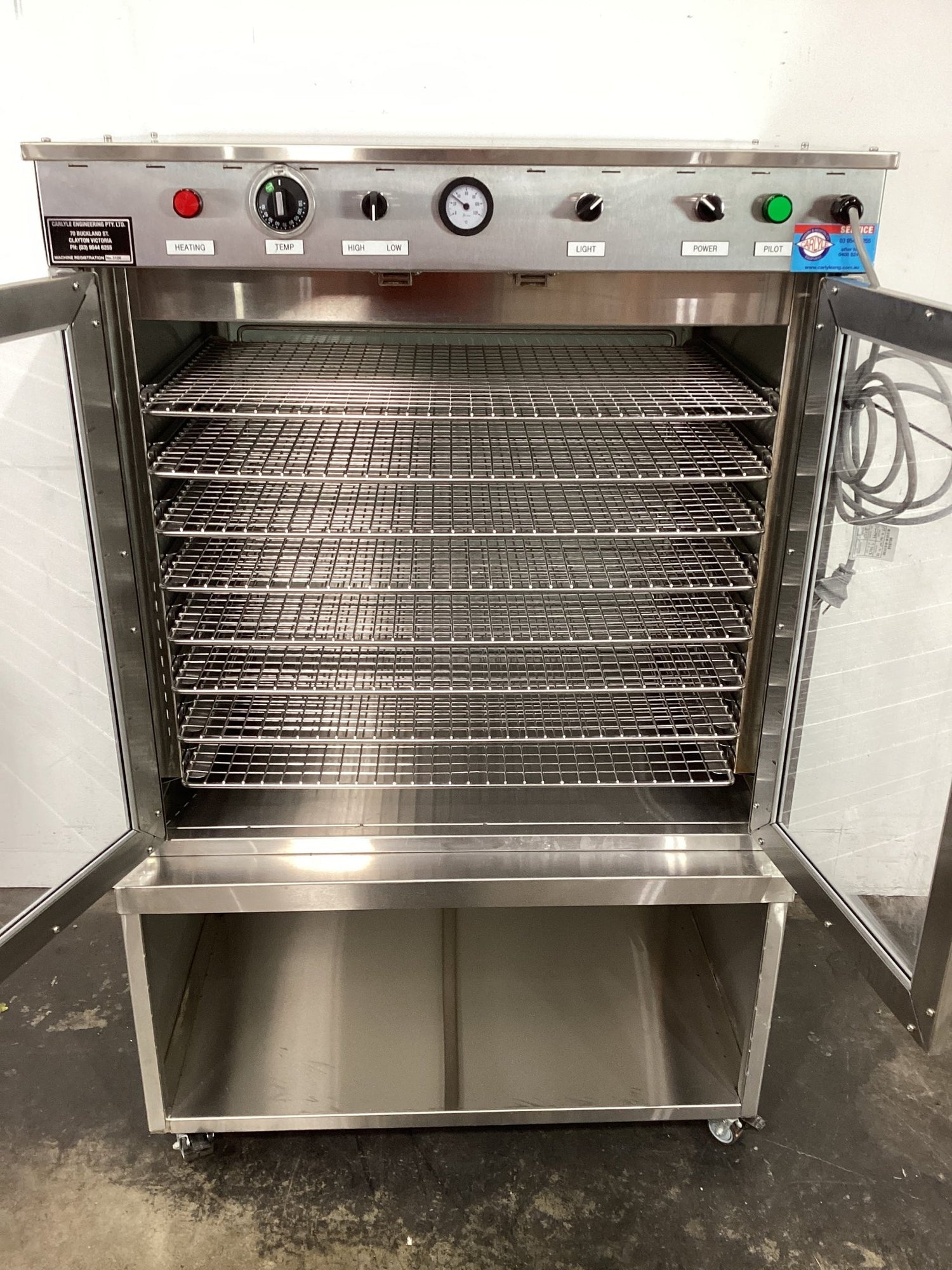 Pie Warmer. Features 240 pie capacity, 8 Tiers, Internal Lighting, 2 Glass Doors, Manual Controls, S/S Finish, Surface Scratches, purpose built stand with castors, 15 Amp 1 Phase, 895mmW x 580mmD x 1360mmH, 200KG