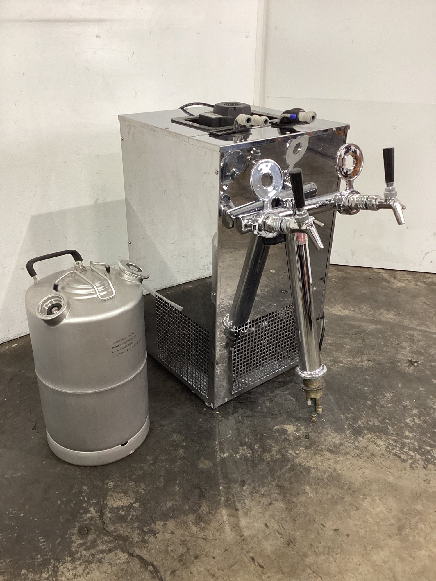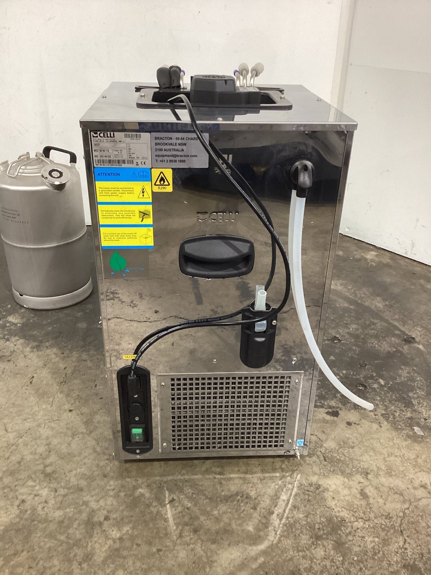 Beer Ice Bank. Features 27L water tank capacity, 15L keg, 2 x taps, 3 x chilling coils, 571W cooling capacity, On rollers, S/S finish, Surface scratches, 10 amp 1 phase, 385mmW x 385mmD x 700mmH, 37KG