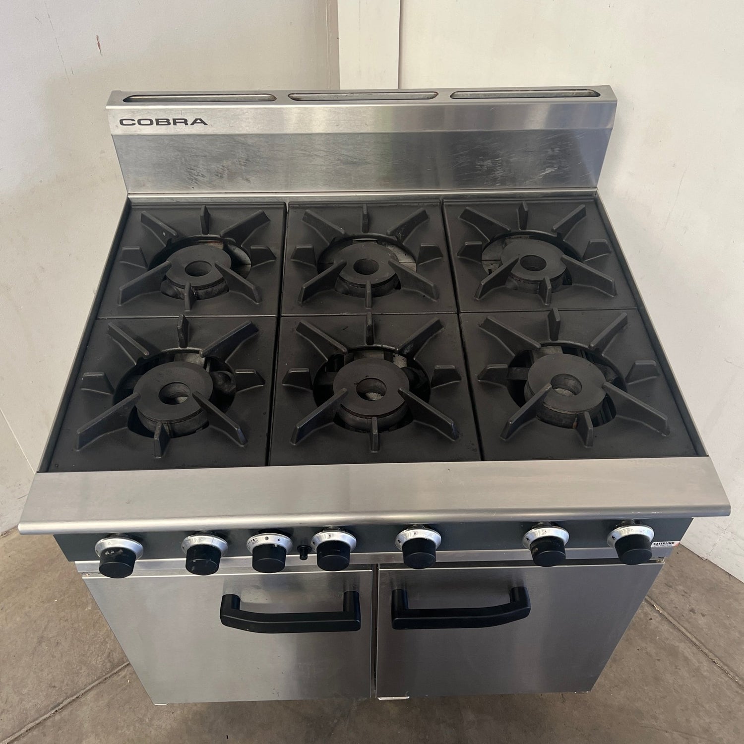 6 Burner Range Oven. Features Static Oven, 4?position racking, 1 Shelf (Capacity For 4), Doors Open To Right & Left, 1 x Drip Tray, Adjustable Feet, Flame Fail Valve, S/S Finish, Scratches & Dents, 4?position racking, Oven size: 760?W × 615?D × 365?H mm, Natural Gas,900mmW x 800mmD x 1085mmH, 150KG