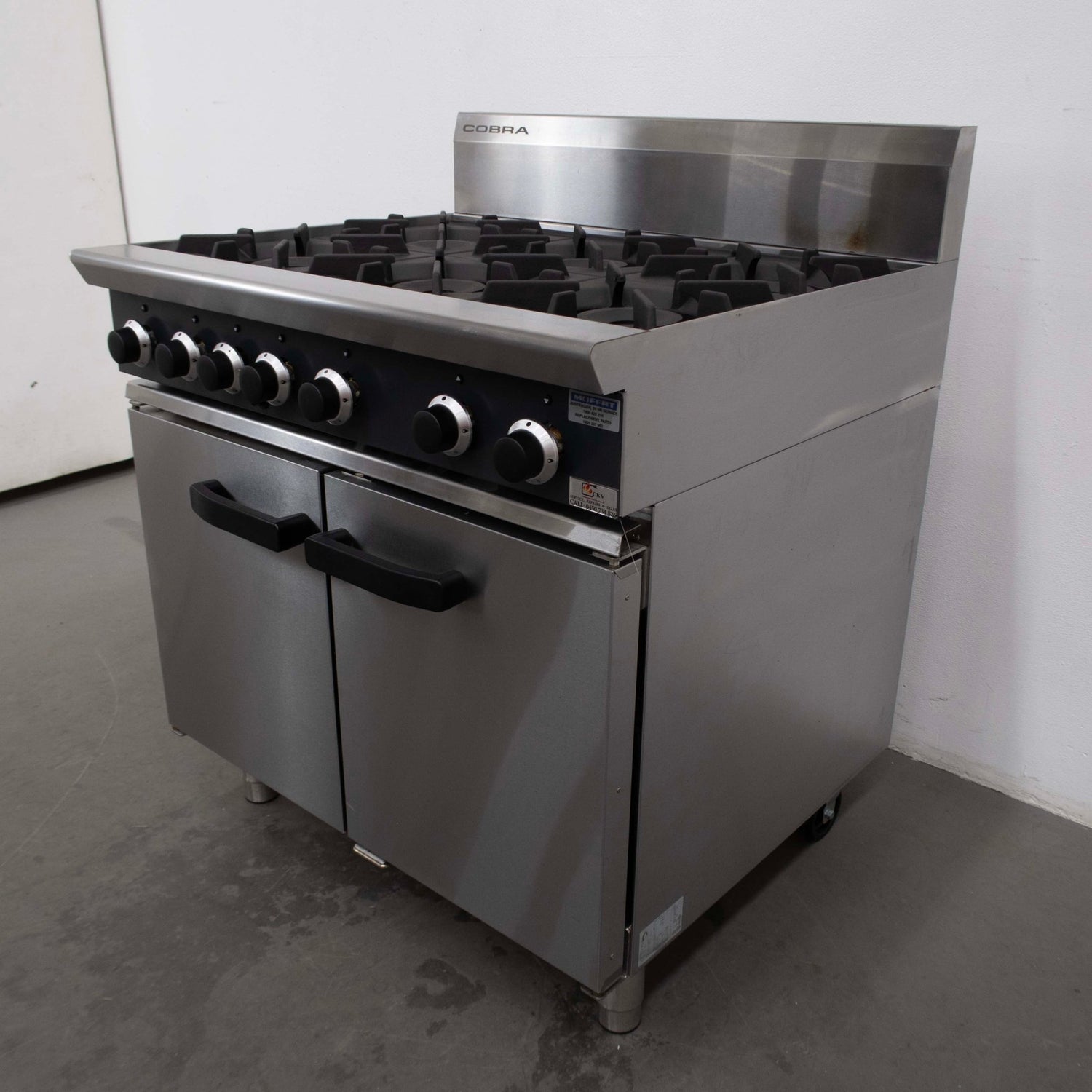 4 Burner Range Oven. Features 160MJ/hr total, Static oven, 1 Shelf (Capacity For 4), French doors, 1 drip tray, Castors on rear, Flame Fail Valve, S/S finish, Scratches & Dents, 6 open burners, Manual pilot ignition, Natural gas,900mmW x 800mmD x 1090mmH, 145KG