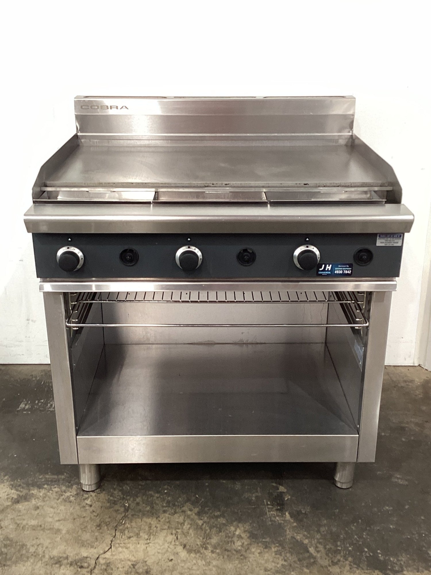 Griddle/Toaster. Features 3 x 21MJ/hr burners, 900mmW flat plate, Toasting rack with 4 rack positions, Crumb tray, Castors on rear, S/S finish, Scratches, Flame fail valve, External regulator, Natural Gas, 900mmW x 800mmD x 1090mmH, 206KG