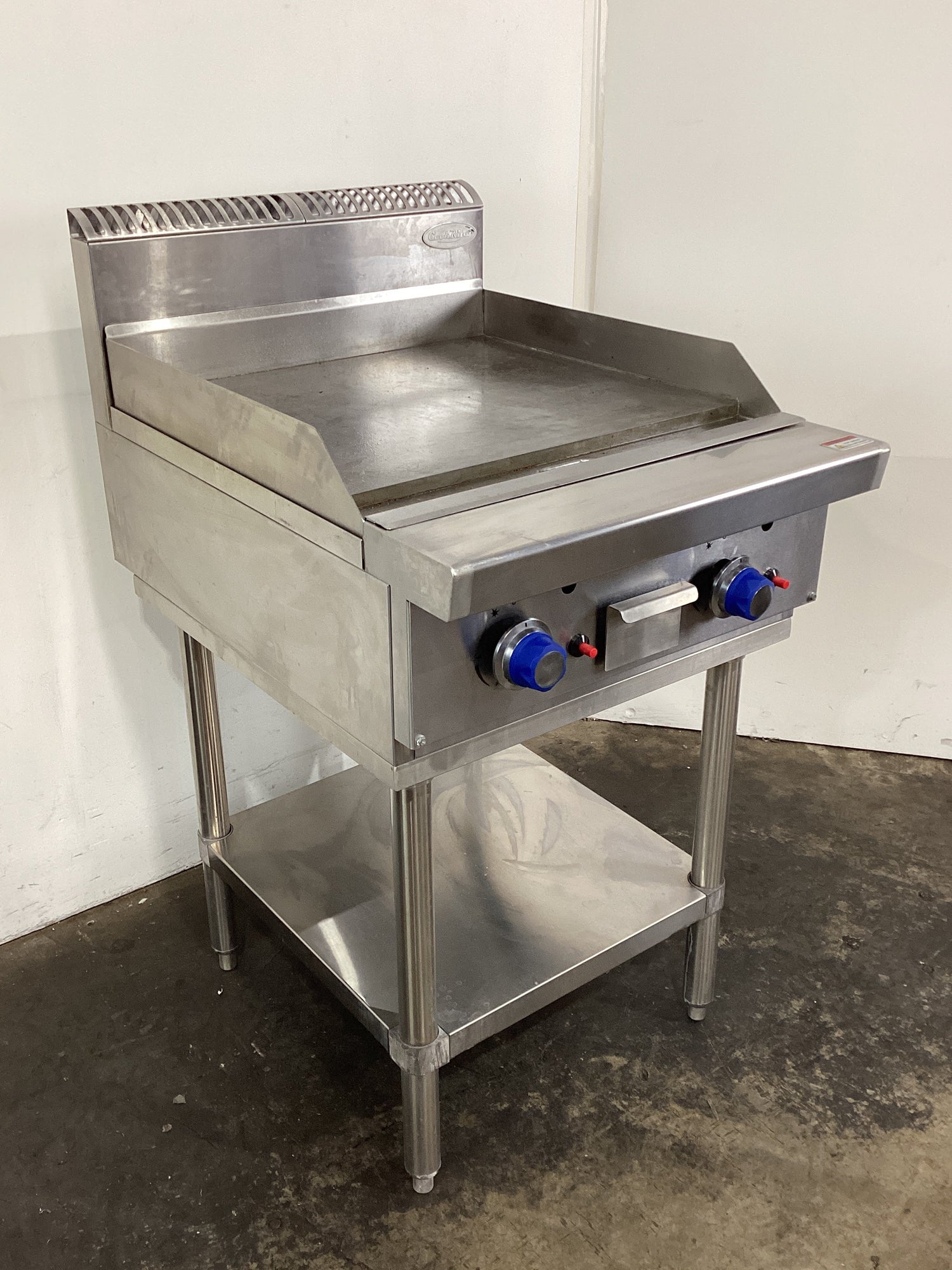 2 Burner Griddle. Features 600mmW flat plate, Drainage well, Fat catcher, Mid shelf, Flame fail valve, External regulator, S/S finish, Scratches, Natural gas,600mmW x 800mmD x 1110mmH, 75KG