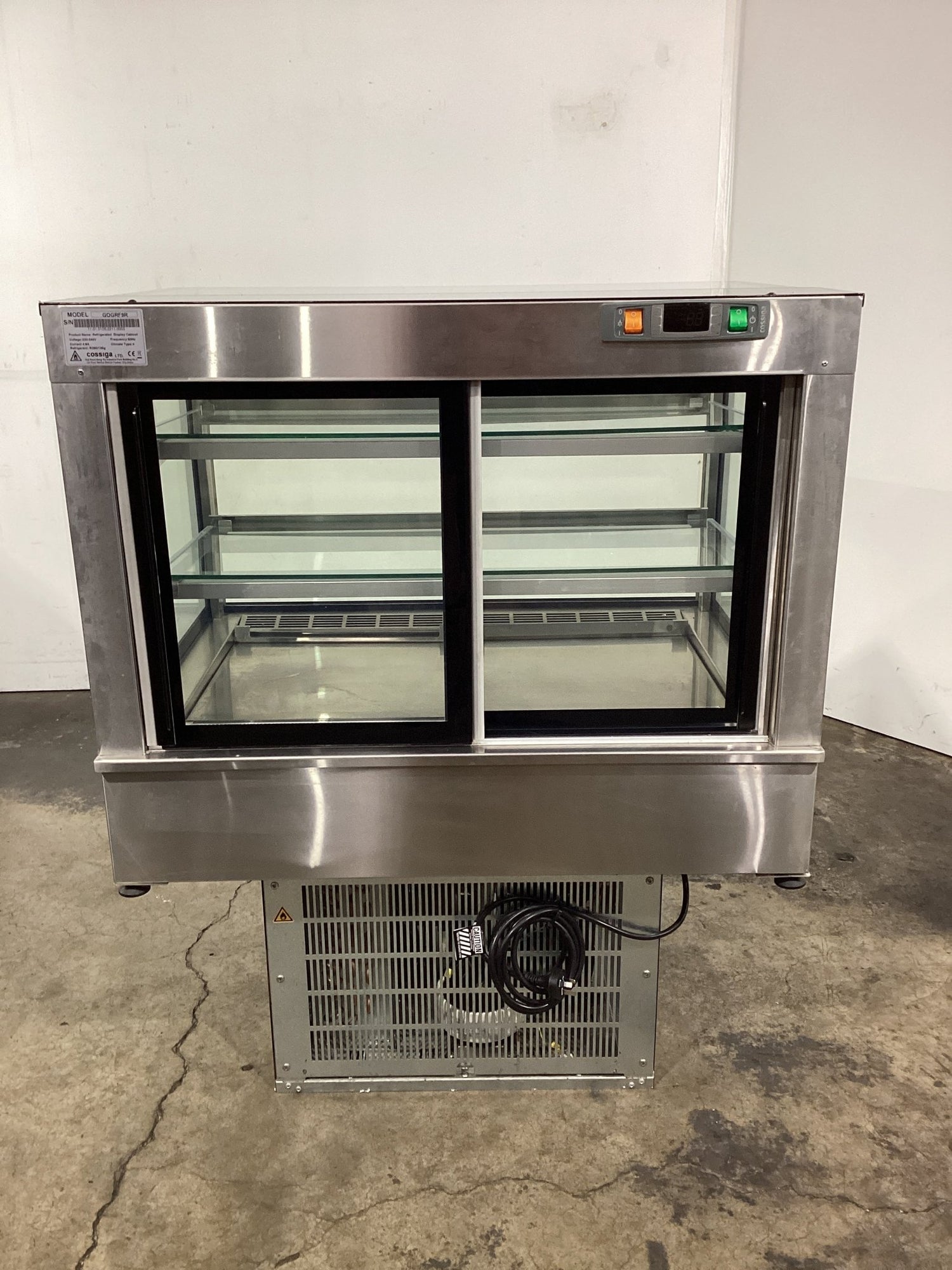 Square Glass Refrigerated Display Cabinet. Features Square Glass, 3 x Tier, Internal LED lighting, 2 x Rear sliding glass doors, Digital temp controls, Climate class normal, S/S Finish, Scratches & Dents, 10 Amp 1 Phase, 905mmW x 650mmD x 1390mmH, 160KG