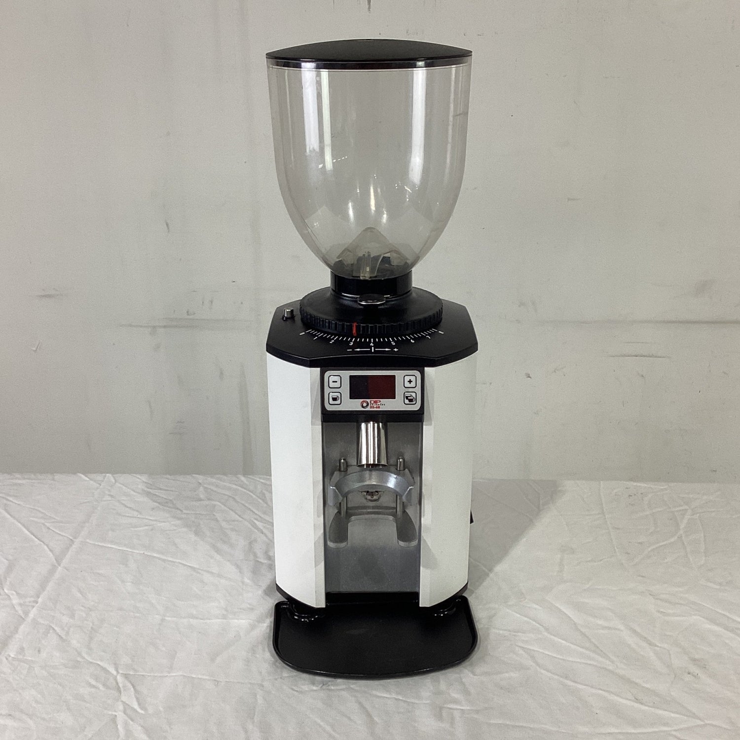 Electronic Coffee Grinder. Features Electronic dosing, 1300g hopper capacity, Counter, Thickness adjuster, Drip tray, White & black finish, Surface scratches, 10 amp 1 phase, 200mmW x 290mmD x 550mmH, 12KG