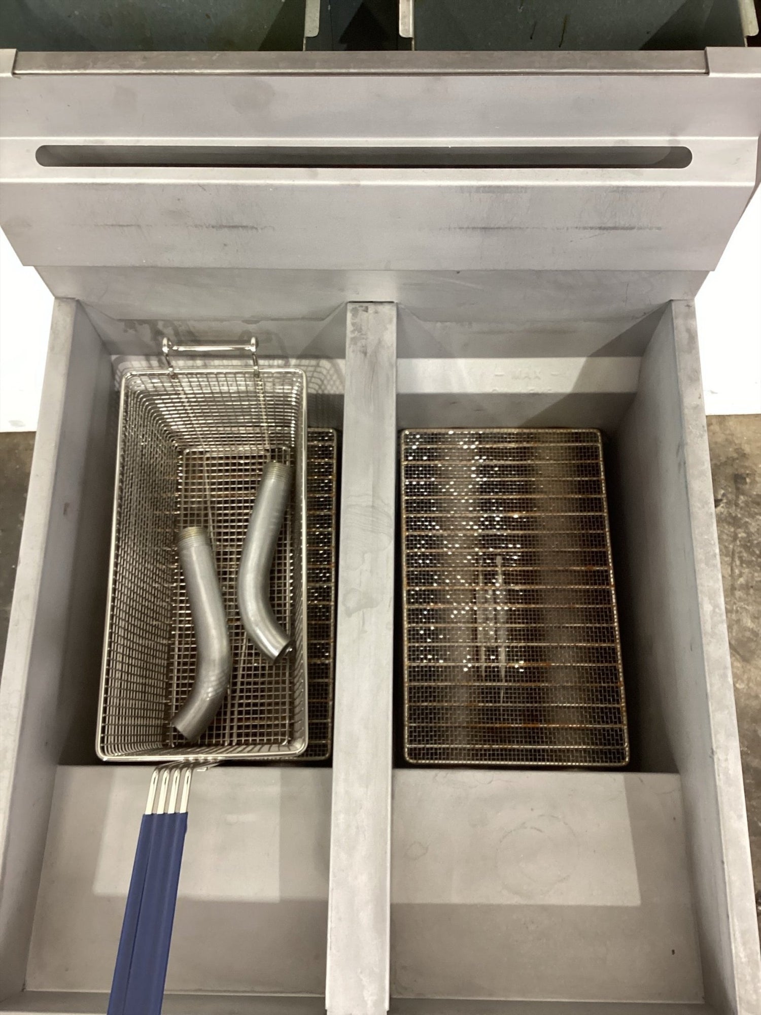 Split Pan Fryer. Features Split Pan, 110Mj/hr, 2 Baskets, 17.5L Capacity Per Pan, Basket Holder, 2 Fish Plates, Drainage Spout, Adjustable Feet, Flame Failure Valve, S/S Finish, Scratches, Internal Regulator, L.P.G,535mmW x 770mmD x 1330mmH, 50KG