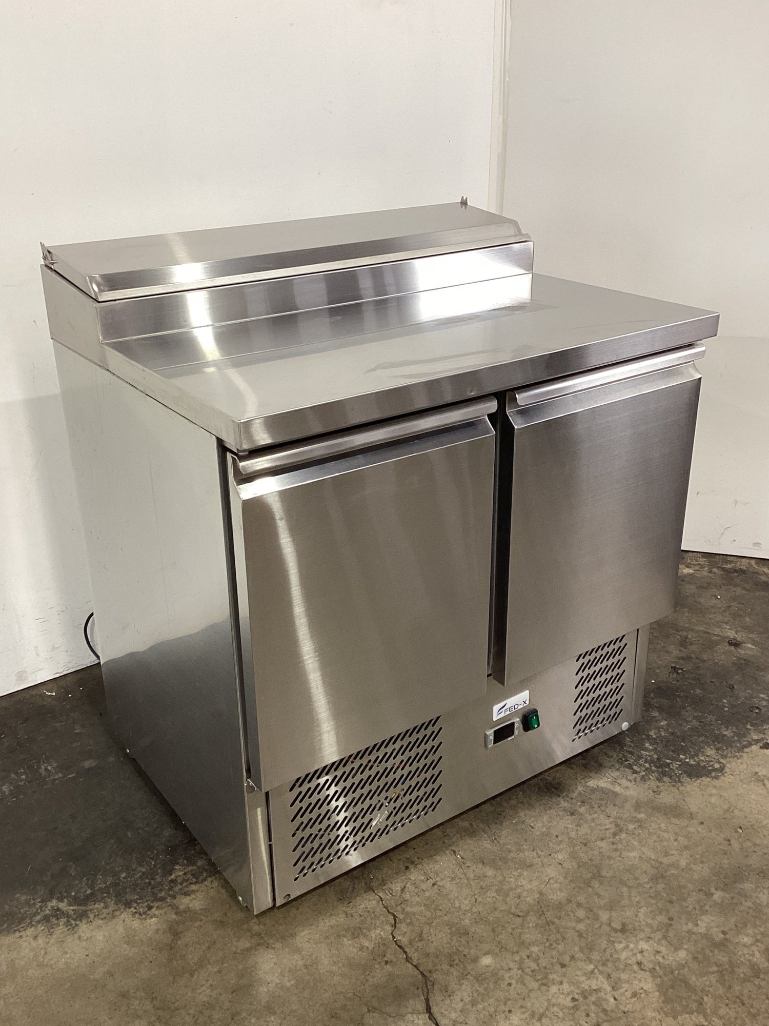 Sandwich Prep Bench. Features 240L capacity, S/S lift up lid, 2 solid door chiller, 5 x 1/4 pans, Digital temp controls 2°C to 8°C, 2 shelves, Bench, On rollers, Climate class normal, S/S finish, Surface scratches, 900mmW x 700mmD x 1020mmH. 81KG. 10 amp, 1 phase.