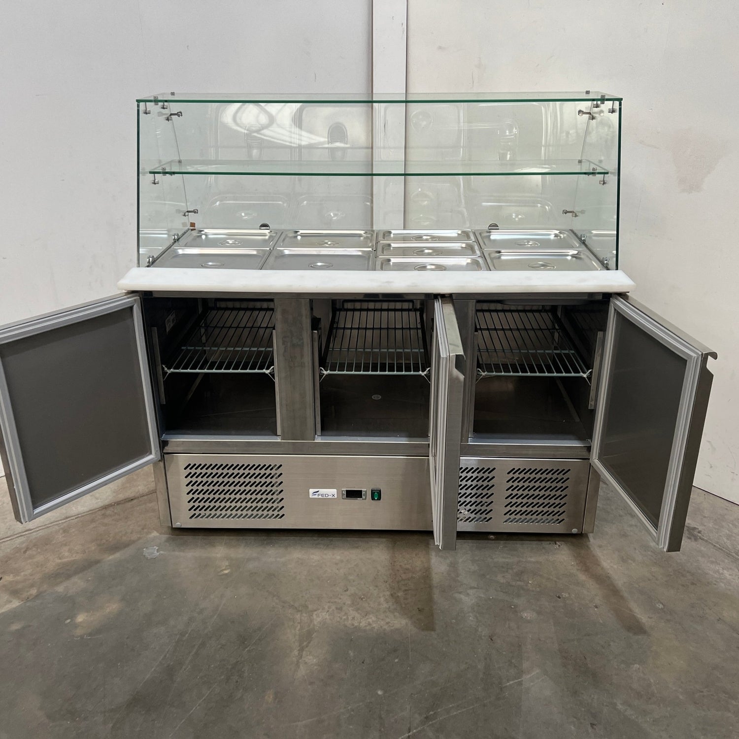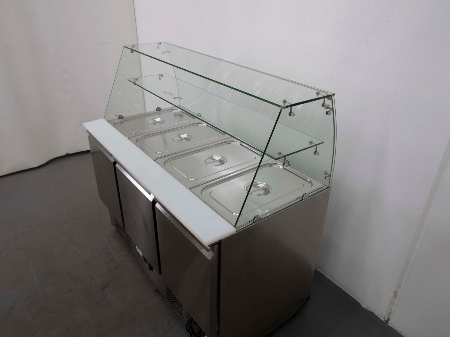 Sandwich Prep Fridge. Features Curved glass canopy, 3 Solid Door Chiller, 6 x 1/2 GN pans + 3 x 1/3 GN pans, 3 x Shelves, Bench with cutting board, On castors, Climate class normal, S/S Finish, Scratches & Dents, Net capacity 368L, 1370mmW x 700mmD x 1310mmH. 104KG. 10 Amp, 1 Phase.