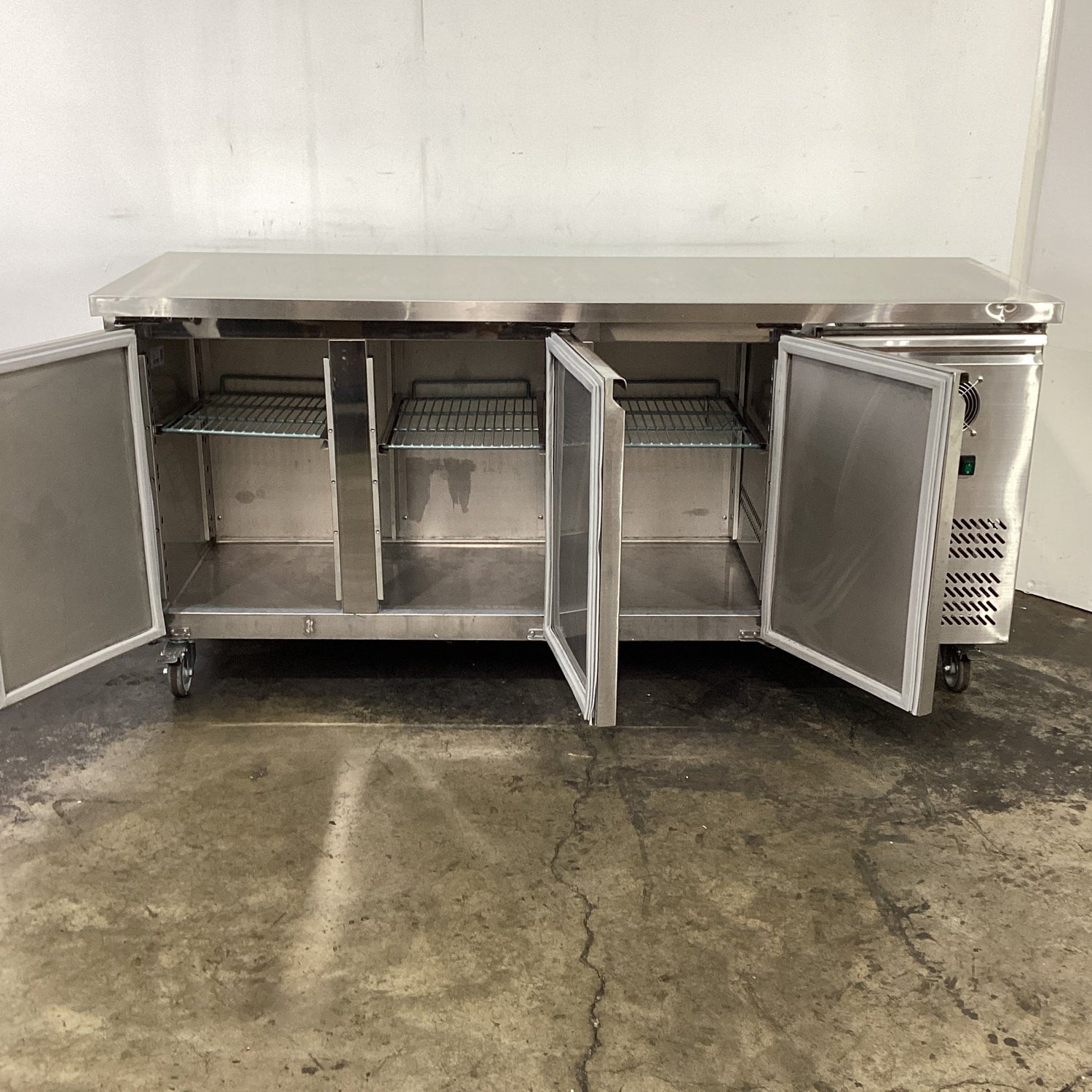 Undercounter Fridge. Features 339L Capacity, Motor On Right, Digital Temp Controls, 3 Shelves, On Castors, Climate Class Normal, 3 Solid Door, S/S Finish, Scratches & Dents, 10 Amp 1 Phase, 1800mmW x 600mmD x 850mmH, 105KG