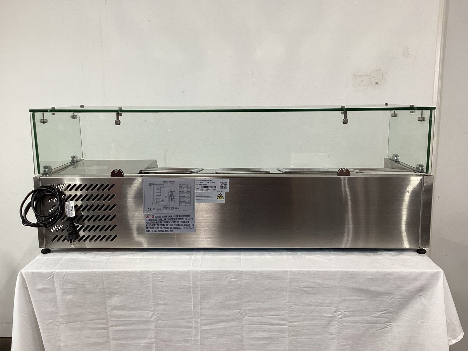 Square Glass C/Top Salad/Sushi Bar. Features Square Glass, 4 x 1/3 Pans With Lids, Digital Temp Controls, Adjustable Feet, Climate Class Normal, S/S Finish, Surface Scratches, 10 Amp 1 Phase, 1200mmW x 400mmD x 450mmH, 28KG
