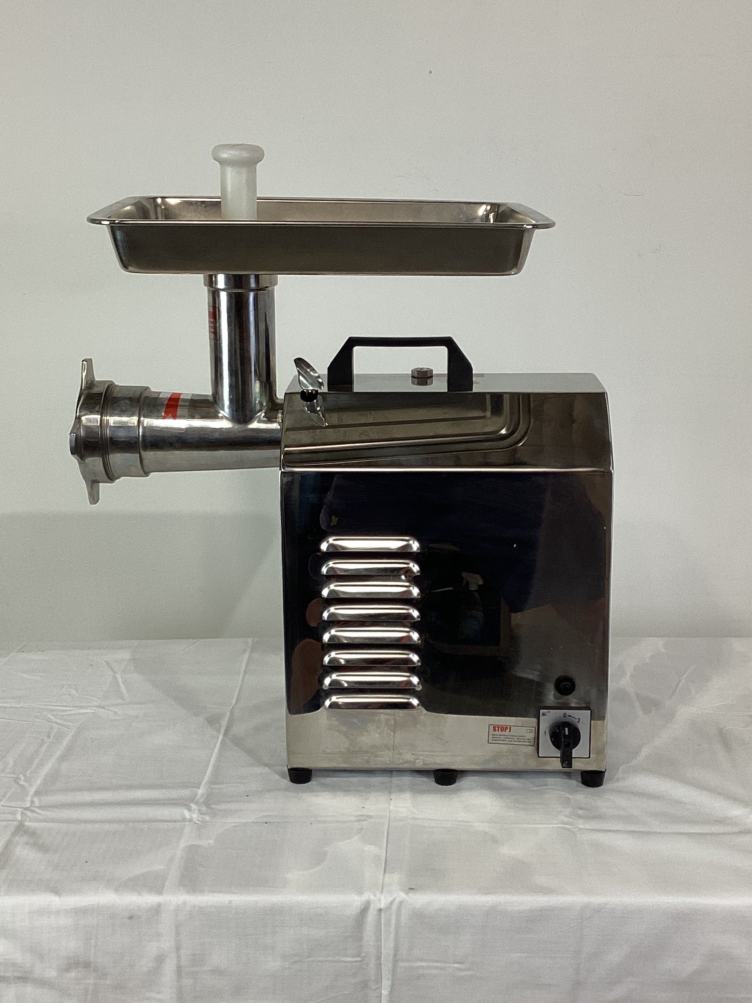 Meat Mincer. Features Up to 280Kg per hour production, 6mm & 8mm plates, Rubber feet, S/S finish, Surface scratches, 10 amp 1 phase, 240mmW x 500mmD x 580mmH, 32KG