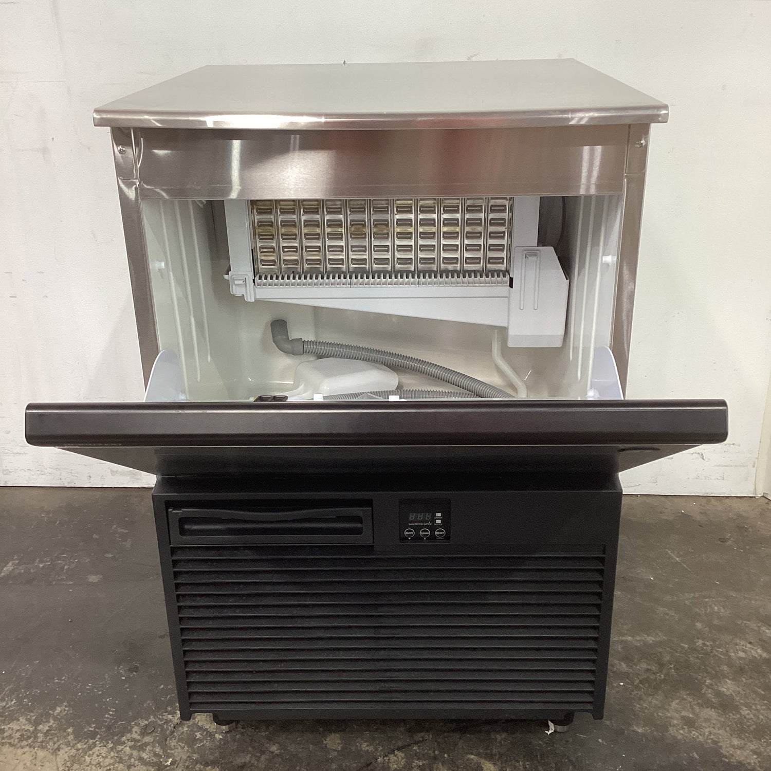 Undercounter Ice Machine. Features Up to 52kg of crescent ice daily production, 23kg storage capacity, Bottom mounted motor, Pump drain, Ice scoop, Adjustable feet, Climate class tropical, S/S finish, Surface scratches, 10 amp 1 phase, 605mmW x 610mmD x 840mmH, 44KG