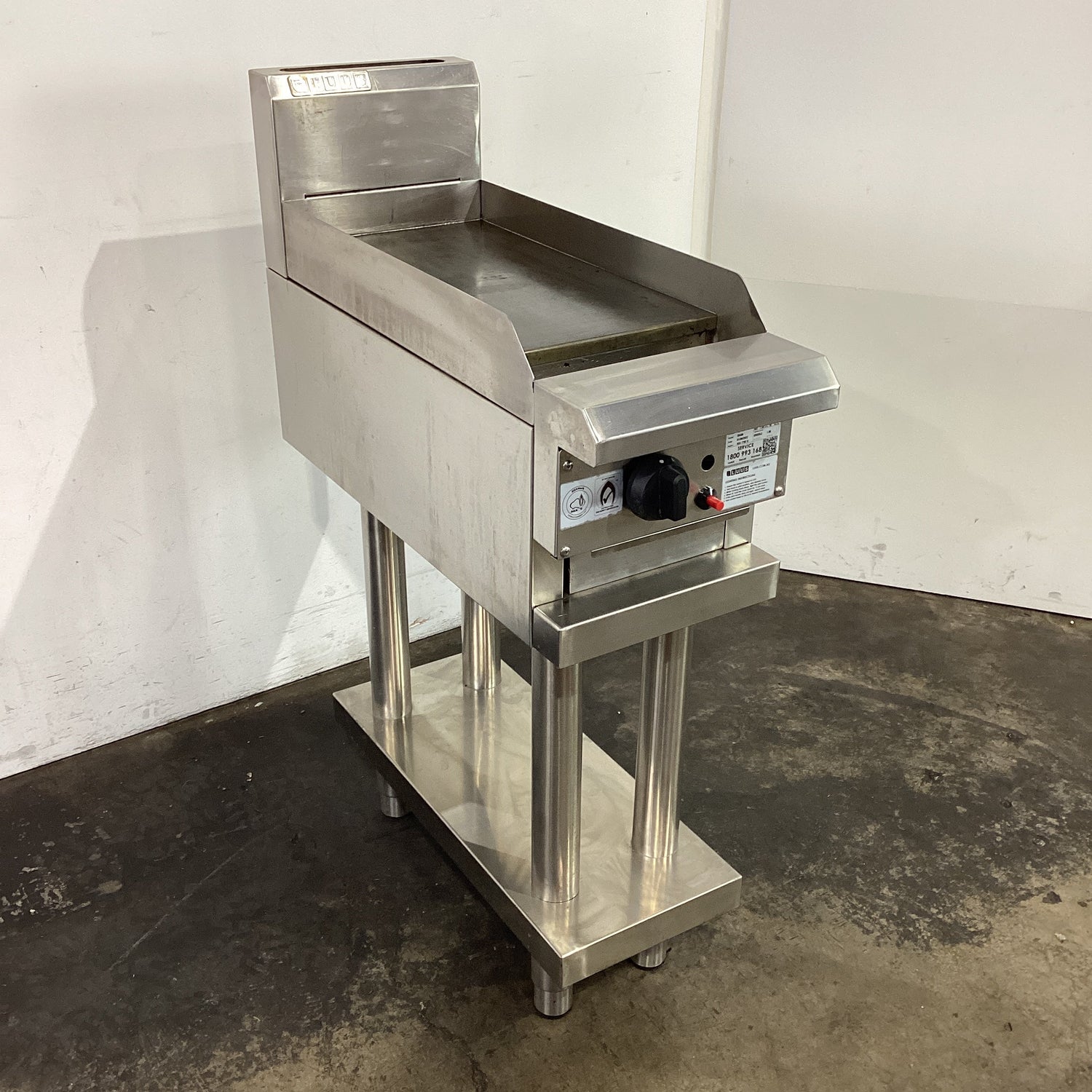 1 Burner Griddle. Features 300mmW Plate, Drainage Well, Fat Catcher, Mid Shelf, Flame Fail Valve, External Regulator, S/S Finish, Scratches, Natural Gas, 300mmW x 805mmD x 1100mmH, 53KG