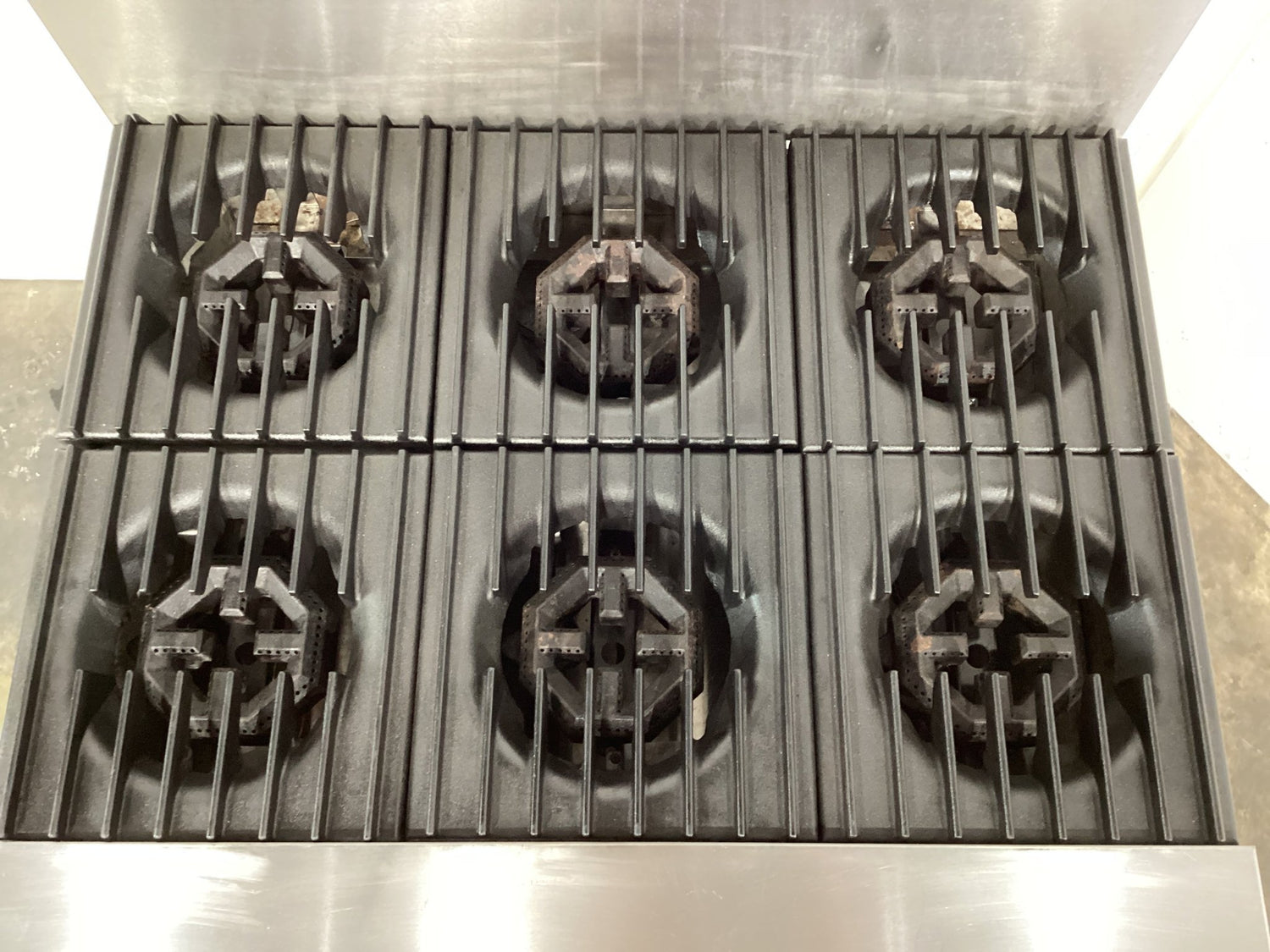 6 Burner Oven Range. Features High performance 32MJ burners with pilots , Static oven, 100?C – 300?C thermostatic, 2 shelves, Pull down oven door, Adjustable feet, Flame fail valve, External regulator, S/S finish, Scratches & dents, Natural gas,915mmW x 850mmD x 1150mmH, 203KG
