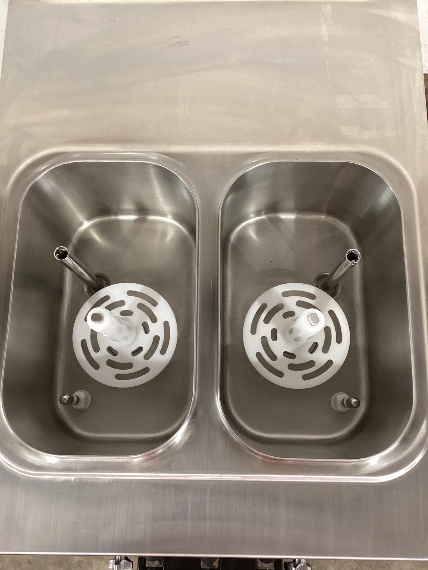 Countertop Ice Cream Machine. Features 50L per hour production, 2 x 9.5L hopper capacity, Gravity feed, Adjustable feet, Climate class normal, S/S finish, Surface scratches, Air cooled, 15 amp 1 phase, 530mmW x 950mmD x 950mmH, 168KG