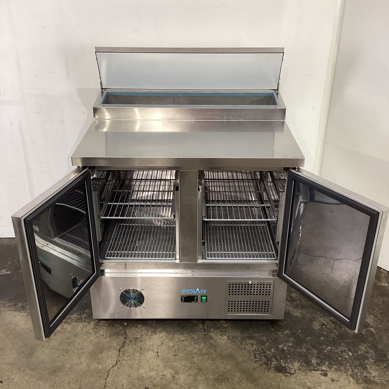 Sandwich Prep Bench. Features S/S lift up lid, 2 solid door chiller, 5 x 1/6 GN pans (No pans supplied), 2 shelves, Bench, Adjustable feet, Climate class normal, S/S finish, Scratches & dents, 900mmW x 700mmD x 990mmH. 80KG. 10 amp, 1 phase.
