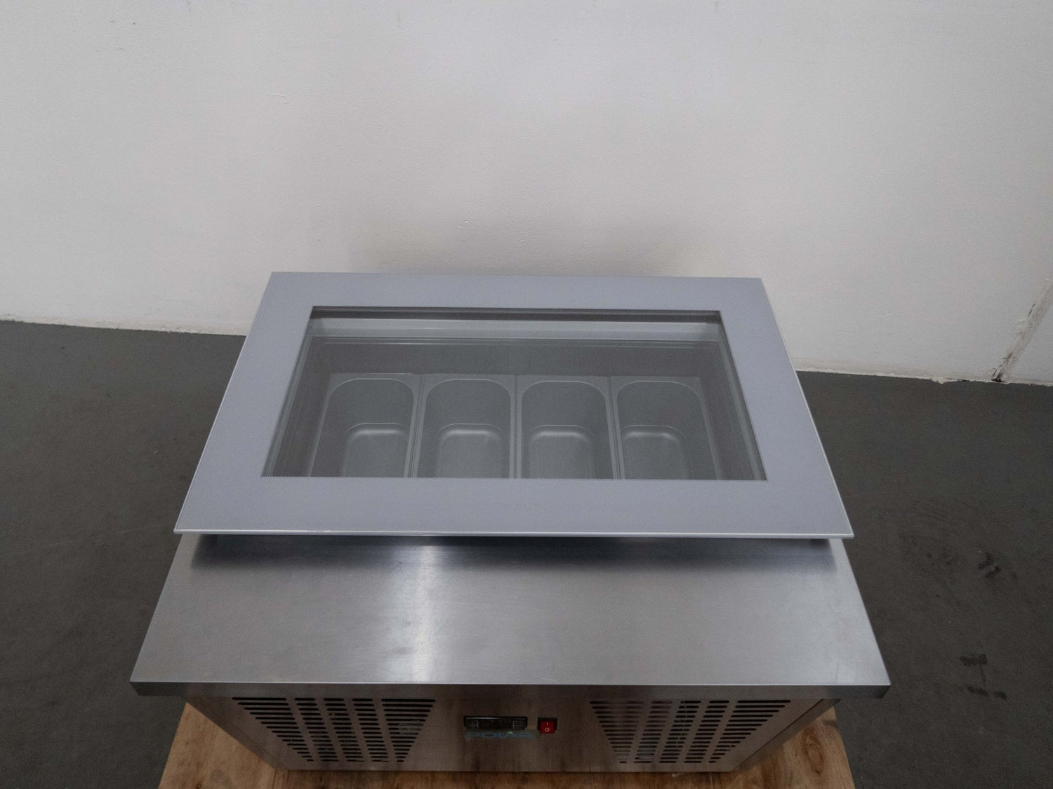 Ice Cream Scoop Freezer. Features Capacity: 87 liters, Hinged Glass Lid:, 4 x Napoli pans, Climate Class Normal, S/S finish, Scratches & Dents, 10 amp 1 phase, 870mmW x 735mmD x 380mmH, 44KG