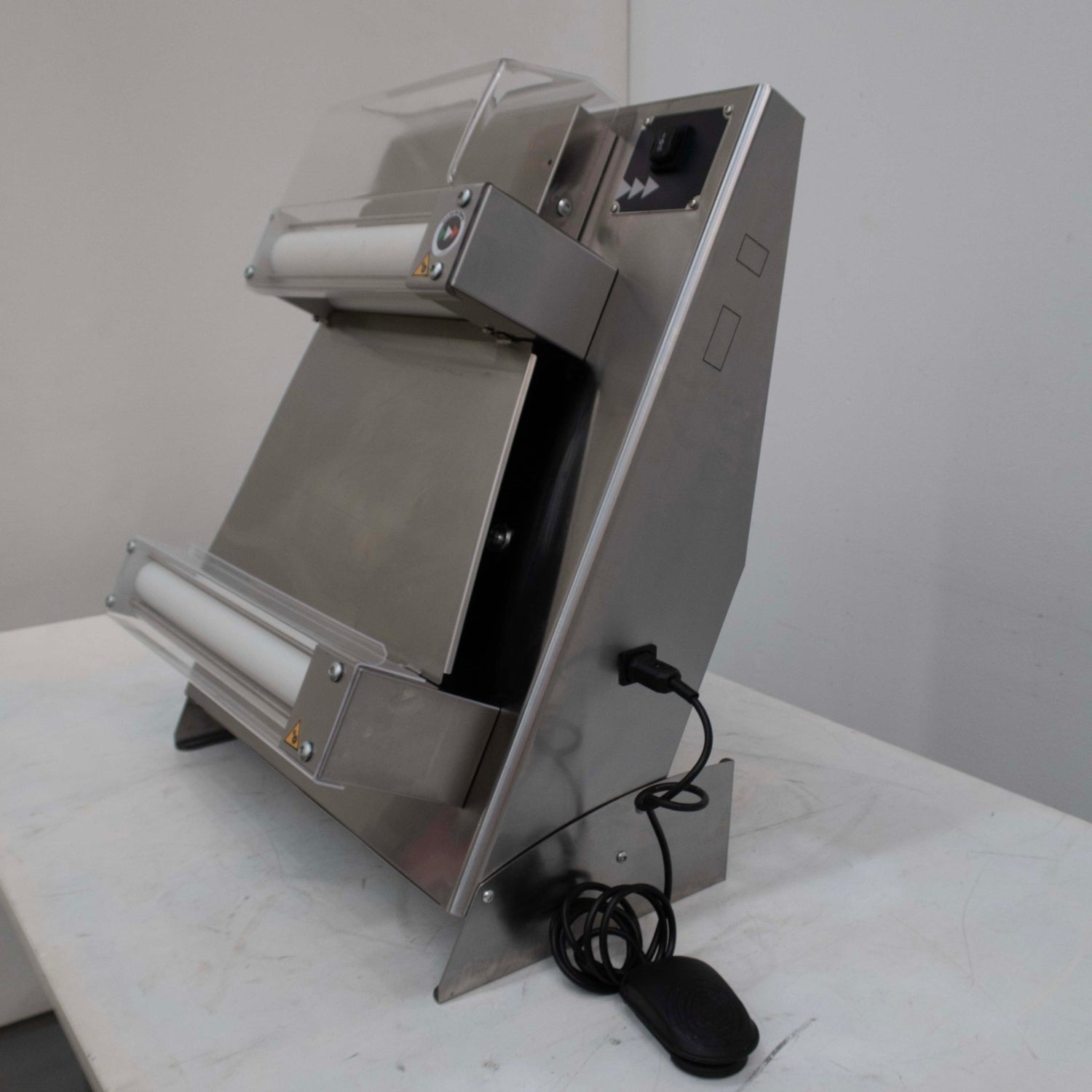 Dough Roller. Features Upper & Lower rollers, Upper & Lower guards, Thickness adjustable from 0 to 4 mm, Electromechanical Control System, On counter, S/S Finish, Scratches & Dents, Foot pedal included, 10 Amp 1 Phase, 580mmW x 305mmD x 710mmH, 38KG