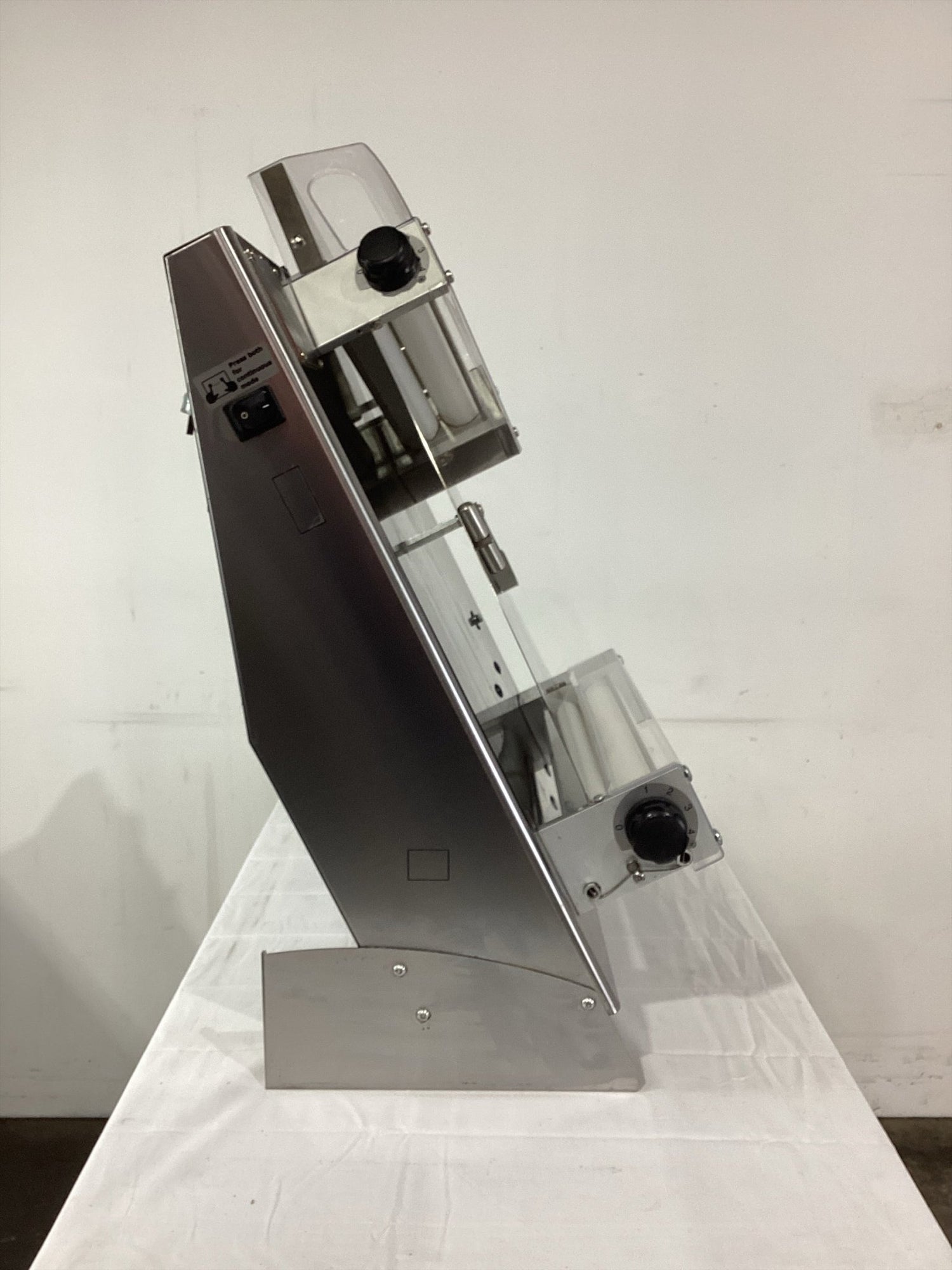 C/Top Dough Roller. Features Single roller, Plastic guard, Thickness adjuster, Timer, S/S finish, Scratches, 10 amp 1 phase, 580mmW x 370mmD x 770mmH, 38KG