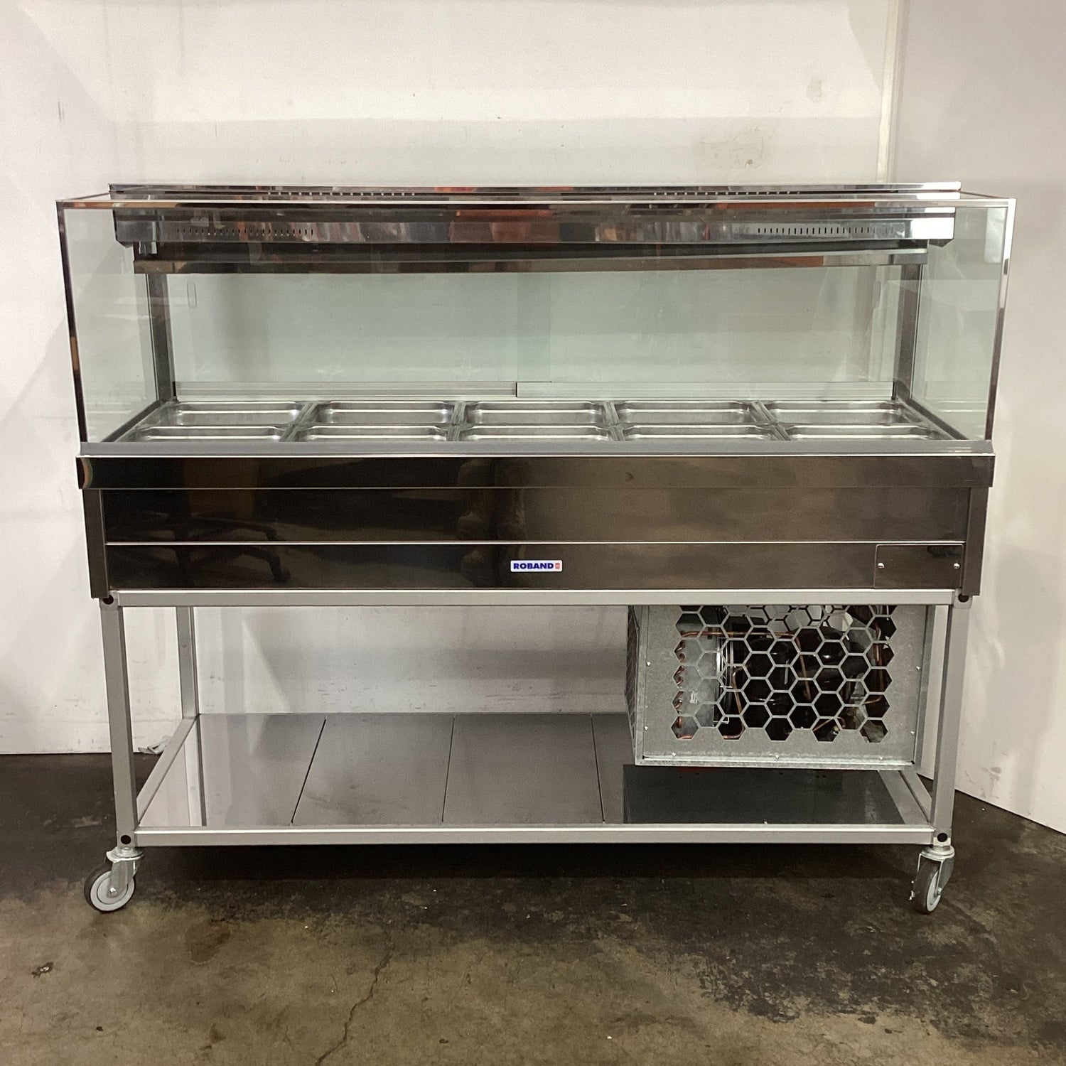 Cold Food Bar With Trolley. Features Square glass, 5 modules, 10 pans, rear sliding doors, Digital temp control, Drainage tap, On castors, X fin cooling, Climate class normal, S/S Finish, Scratches, 10 amp 1 phase, 1680mmW x 655mmD x 1400mmH, 160KG