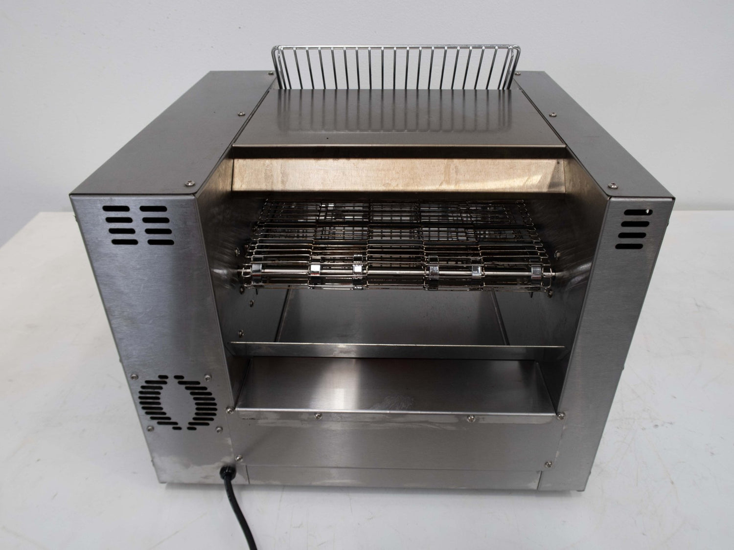Conveyor Toaster. Features Toasting Capacity: Up to 300 slices per hour, Top & Bottom Or Top Only Heat Selection,Speed Control, Crumb Tray, Slide, Rubber Feet, Entry & Exit Options: Front entry with adjustable front return or pass-through exit chute, S/S finish, Scratches & Dents, 475mmW x 520mmD x 440mmH. 23KG. 10 amp, 1 phase.