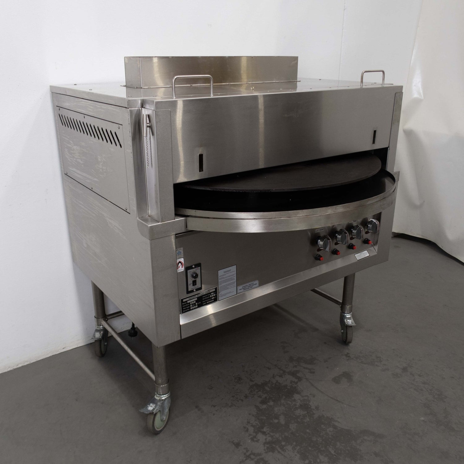 Gas Oven. Features On Castors, S/S finish, Surface scratches, Rotating Plate: Variable speed rotating plate, Burners: 4 gas burners for even heat distribution, Heating: Utilizes heating tiles, 10 amp 1 phase, Natural Gas,1200mmW x 1150mmD x 1360mmH, 130KG