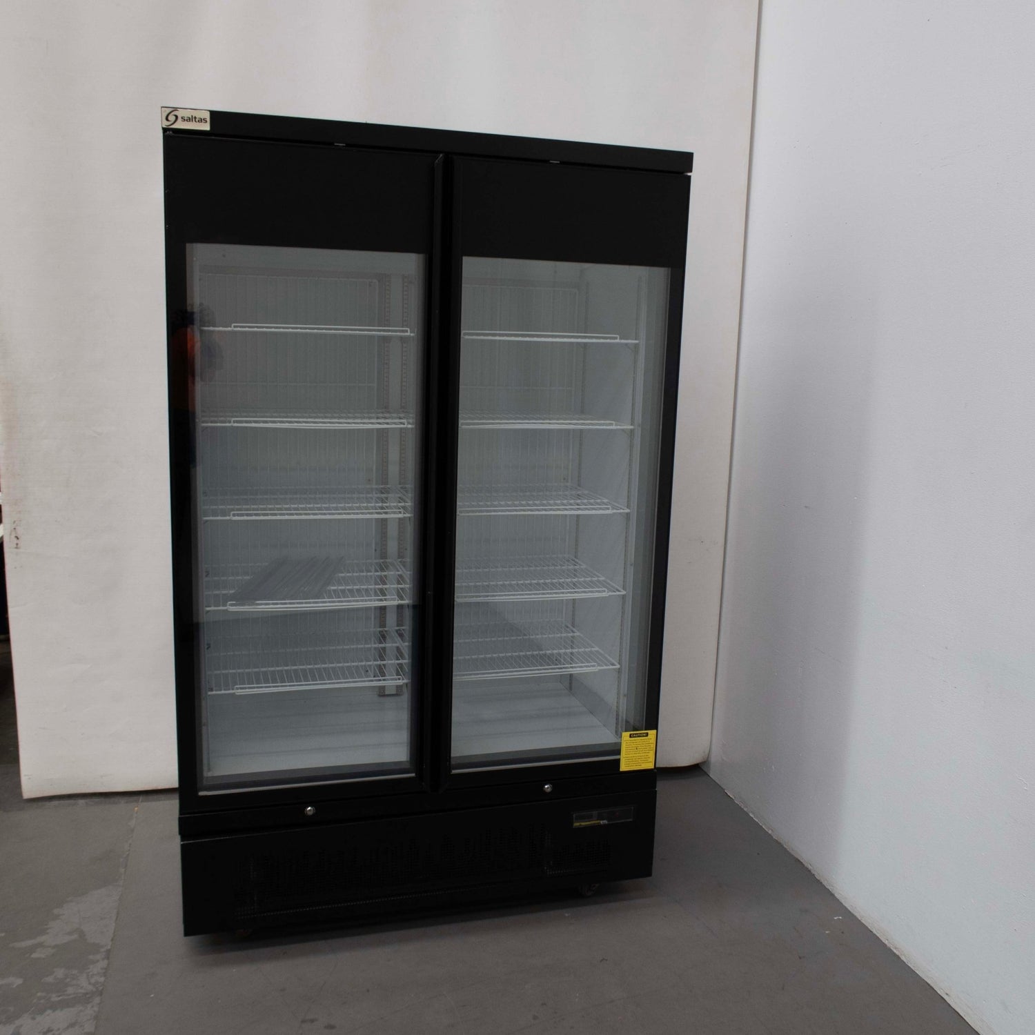 Upright Fridge. Features 2 Glass Door(s), Bottom Mounted Motor, Capacity 850?L, Automatic Defrost, Internal LED Lighting, Digital Temp Controls, 10 x Shelves, On Castors, Climate Class Normal, Black Finish, Scratches & Dents, 10 Amp 1 Phase, 1250mmW x 710mmD x 2025mmH, 215KG