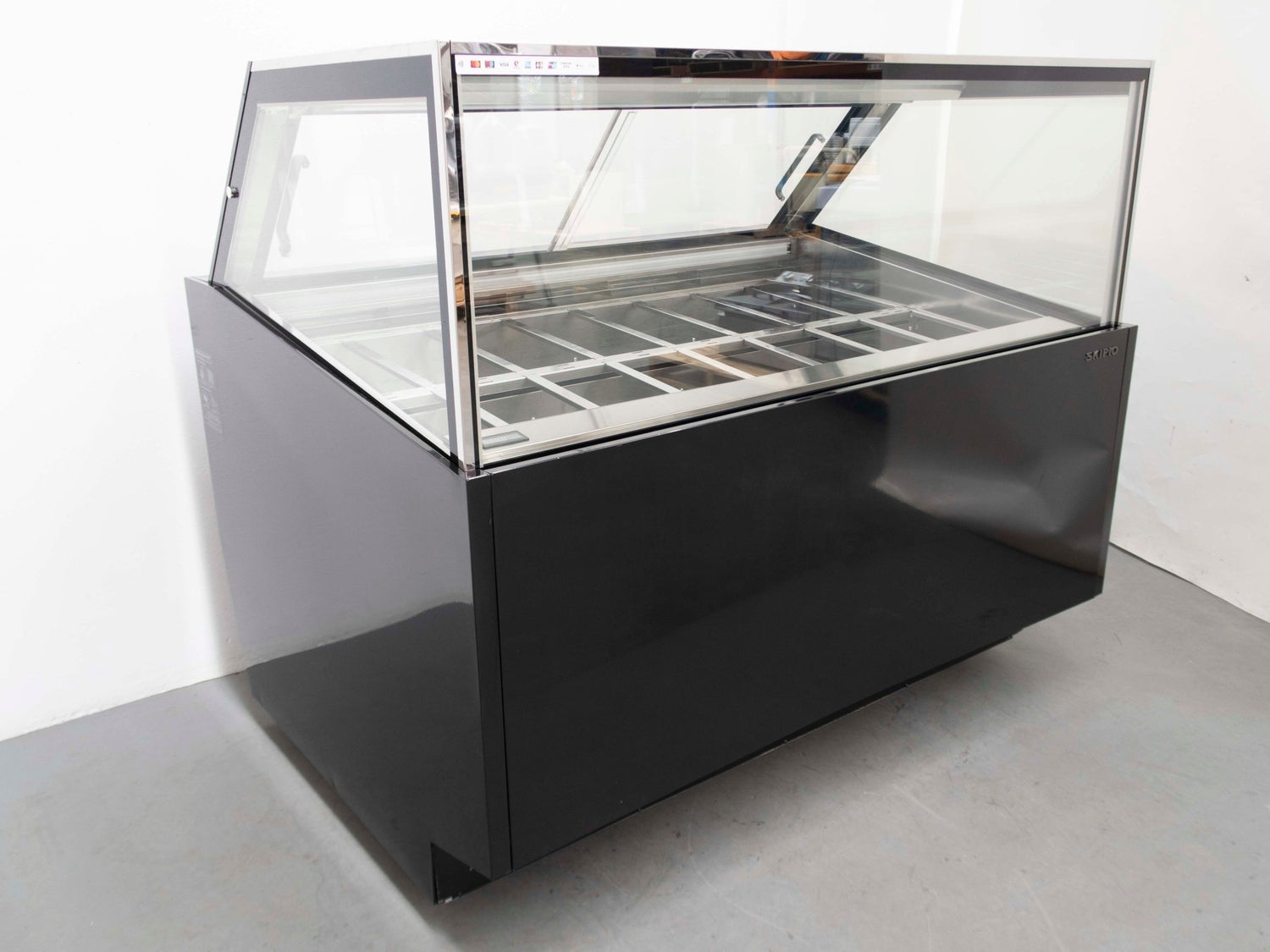 Angled Glass Gelato Display. Features 16 x Pans capacity, Internal LED lighting, 2 x Rear sliding doors, Digital temp controls, Climate class normal, On castors, Black, Scratches & Dents, Angled Glass, Fan cooling type, 15 Amp 1 Phase, 1545mmW x 1105mmD x 1330mmH, 260KG