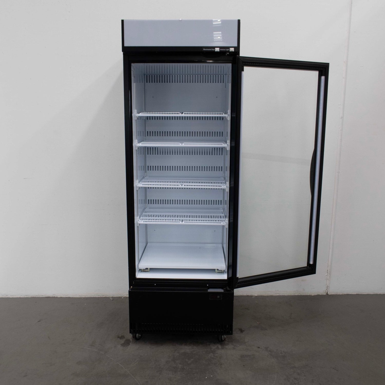 Upright Fridge. Features 1 Glass Door(s), Bottom Mounted Motor, Internal LED Lighting, Digital Temp Controls, 4 x Shelves, On Castors, Climate Class Sub Tropical, Fan?forced, 10 Amp 1 Phase, Volume 559?L, Black Finish, Scratches & Dents,740mmW x 790mmD x 2200mmH, 125KG