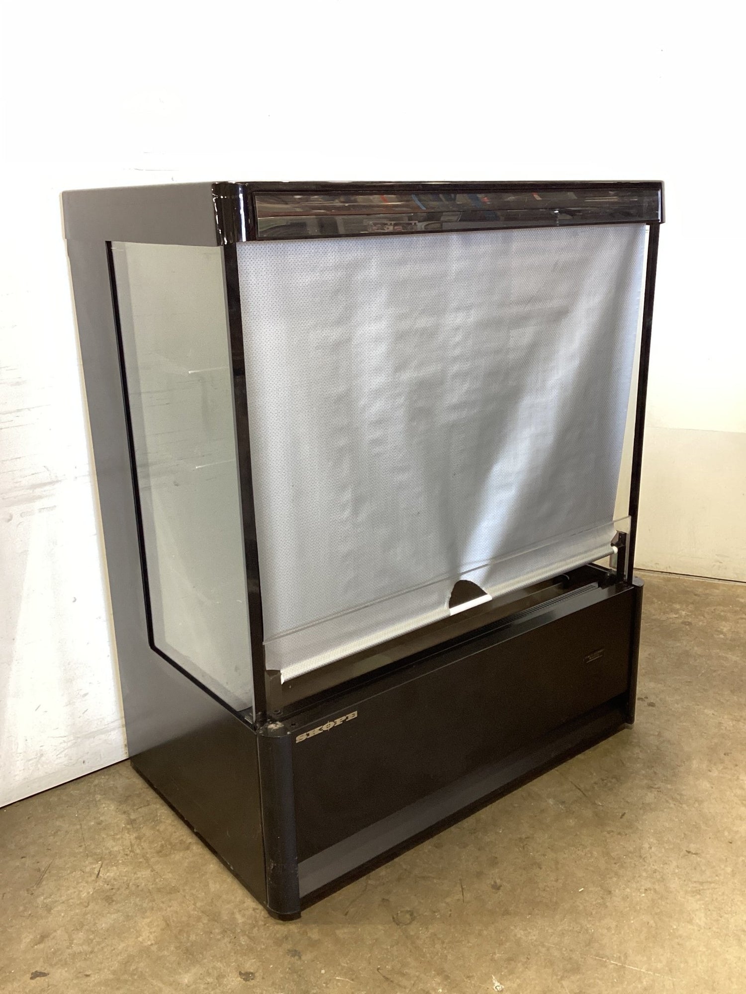 Reach In Display. Features Temp range -1 to 5c, 3 shelves, Internal lighting, Retractable curtain, Climate class normal, On castors, Black finish, Scratches, 10 amp 1 phase, 1280mmW x 770mmD x 1525mmH, 248KG
