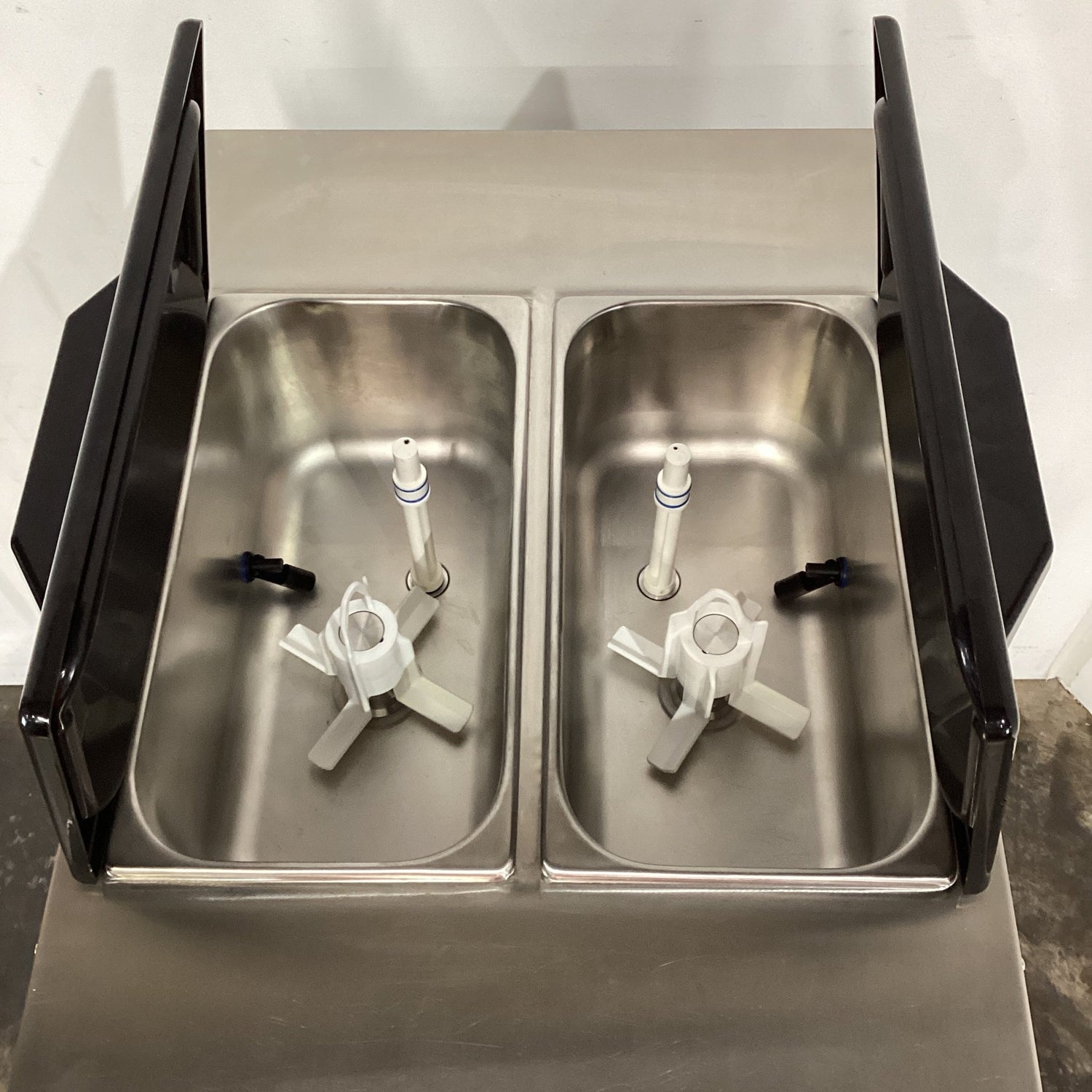 Ice Cream Machine. Features Up to 450 (80g) serves/hr, 2 x 12L pans, Gravity feed, Rubber feet, Climate class normal, S/S finish, Surface scratches, 20 amp 1 phase, 530mmW x 780mmD x 1470mmH, 210KG