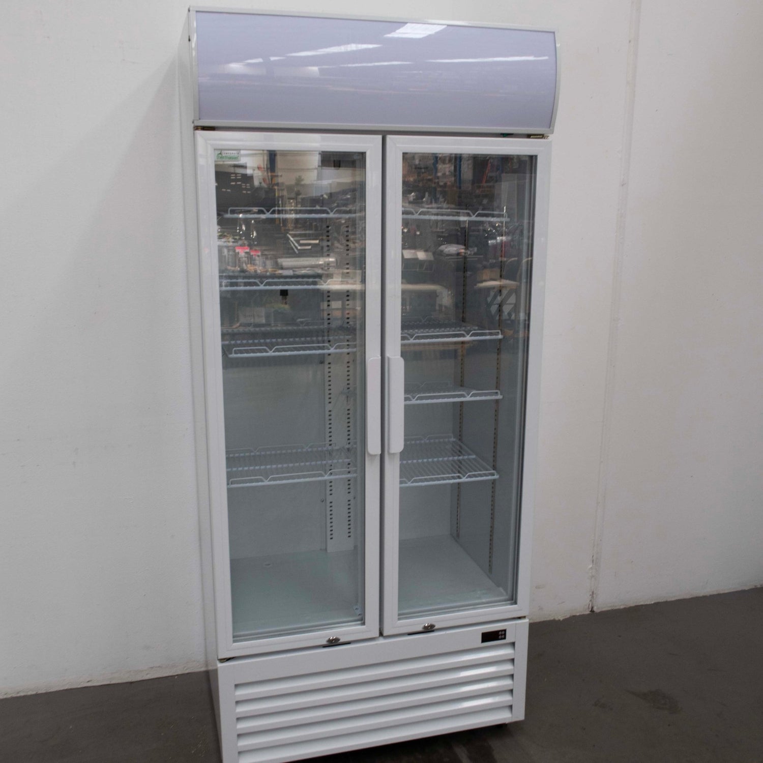 Upright Fridge. Features 2 Glass Door(s), Bottom Mounted Motor, Internal LED Lighting, Digital Temp Controls, 8 x Shelves, On Castors, Climate Class Tropical, White Finish, Scratches & dents, Capacity 570L, Cooling type Fan?forced, 10 Amp 1 Phase, 880mmW x 600mmD x 1980mmH, 96KG