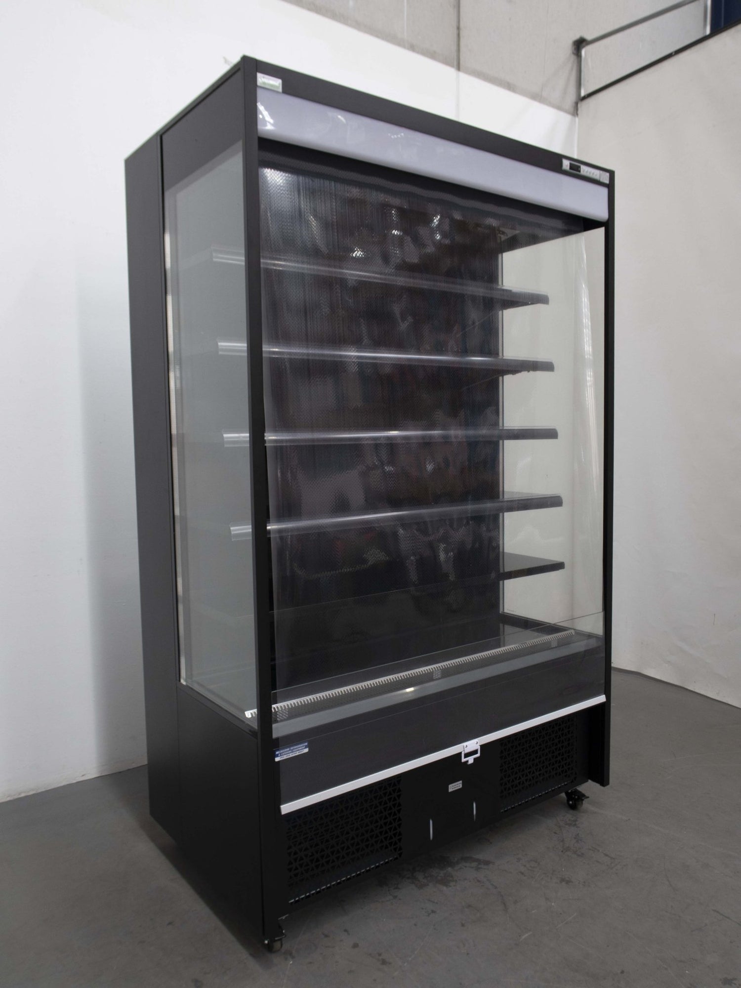 Multi Deck Display. Features Internal LED Lighting, Digital Temp controls, Retractable Curtain, On castors, Climate class normal, Black Finish, Scratches & Dents, Capacity 540 litres, 6 level display, 15 Amp 1 Phase, 1280mmW x 745mmD x 2060mmH. 275KG.