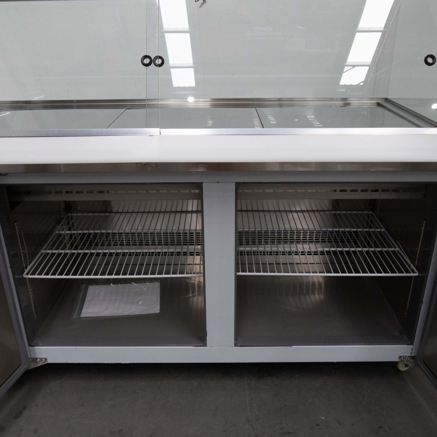 Sandwich Prep Fridge. Features Angled glass canopy, 2 Solid Door Chiller, 5 x 1/1 Gn pans, 2 Rear sliding doors, 2 x Shelves, Bench with cutting board, On castors, Climate class normal, S/S Finish, As New, Capacity 800L, Auto defrost with a separate control button, Automatic condensation evaporation, 1800mmW x 790mmD x 1285mmH. 187KG. 10 Amp, 1 Phase.