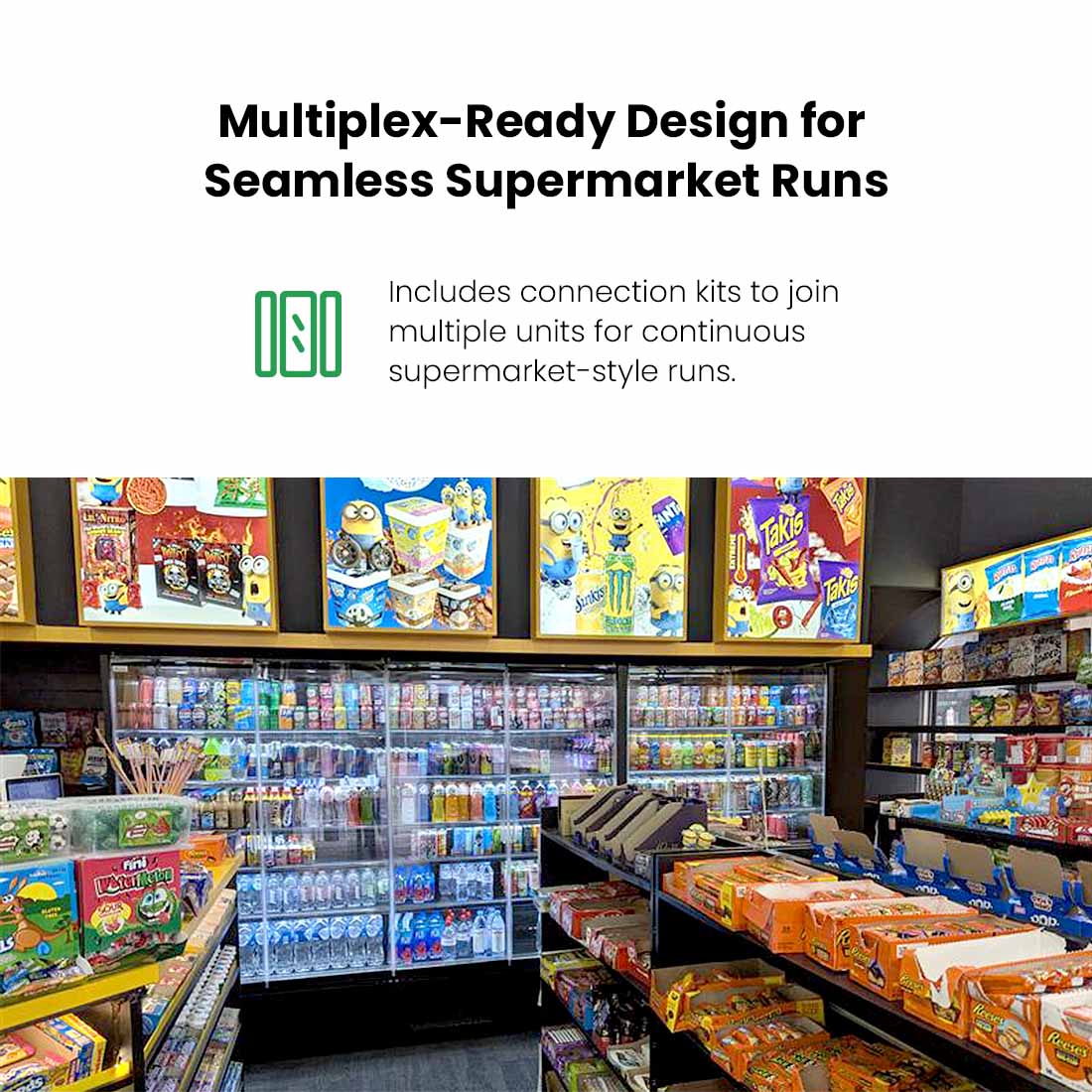 - Optimized Product Presentation: Frameless glass doors and transparent end walls maximize the display area, allowing product contents to be viewed from the front and sides.