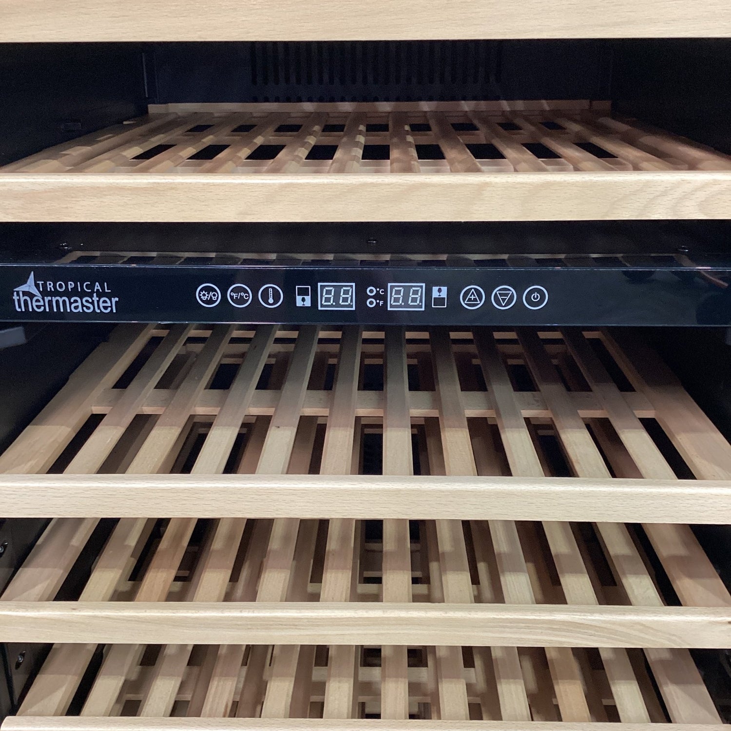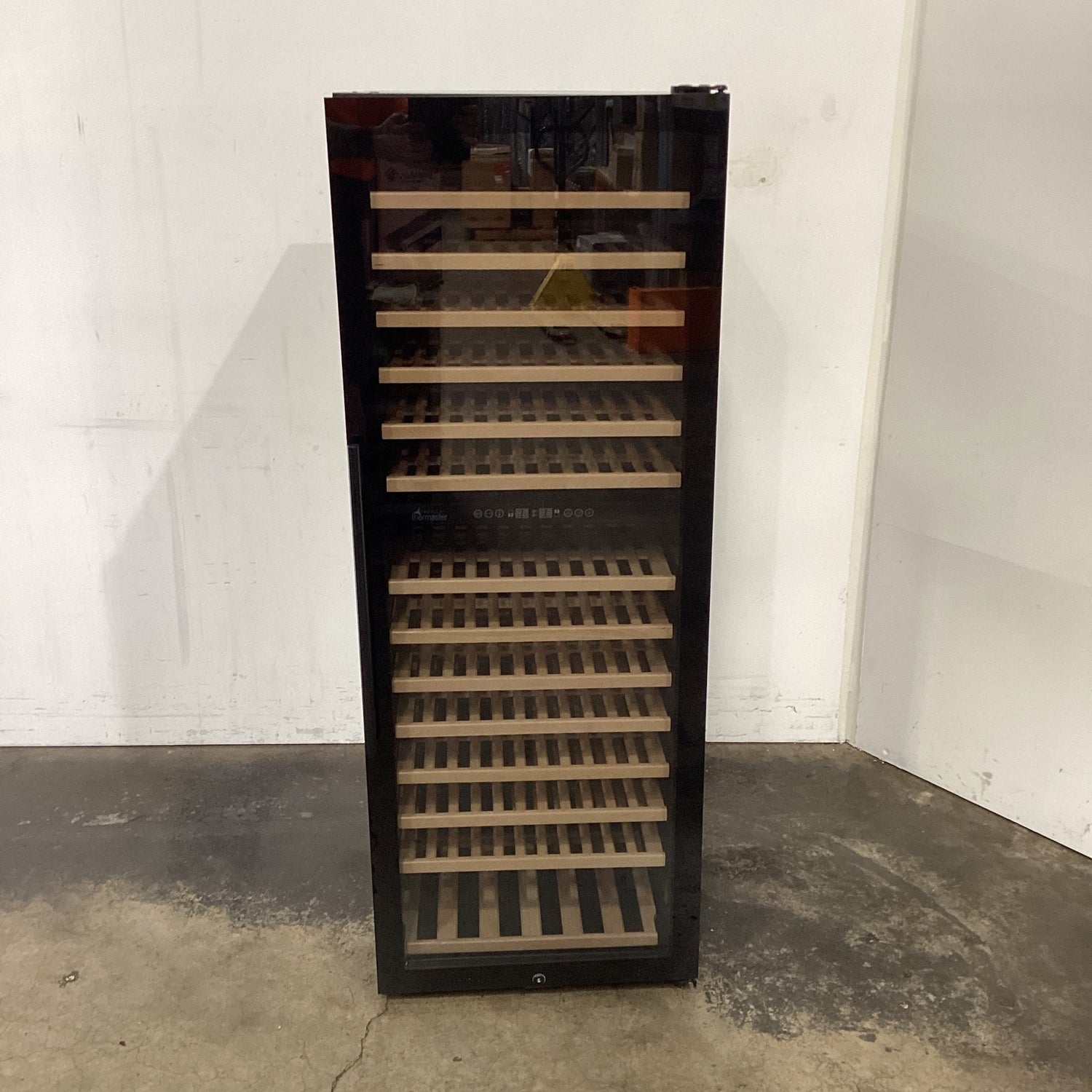 Duel Zone Wine Cabinet. Features 1 glass door, Up to 155 bottle capacity, Internal lighting, Multi temp controls 5°C to 12°C, 14 shelves, Adjustable feet, Climate class normal, Black finish, Surface scratches, 10 amp 1 phase, 600mmW x 750mmD x 1630mmH, 82KG