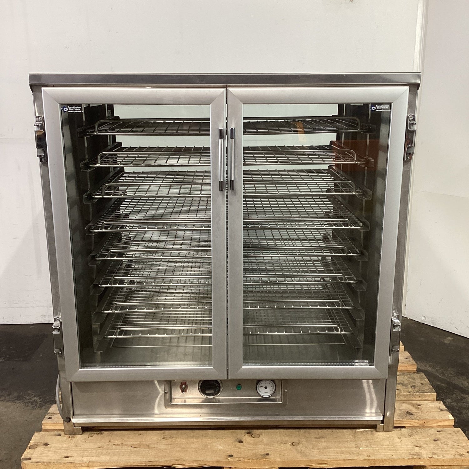 Pie Warmer. Features Fan forced heat distribution, 8 x full size bakers wires, Internal lighting, 2 rear glass doors, Manual controls, Crumb tray, S/S finish, Scratches, 15 amp 1 phase, 920mmW x 680mmD x 975mmH, 150KG
