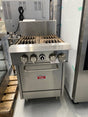 4 Burner Oven Range. Features Cooking area: 610mmW x 610mmD, Temperature range: 100°C to 300°C, Stainless steel spill trays, 32.5 MJ/Hr cast iron open burners, Flame failure protection, Slight surface rust on cast iron plates + stainless steel body, Ex-showroom display model, LPG