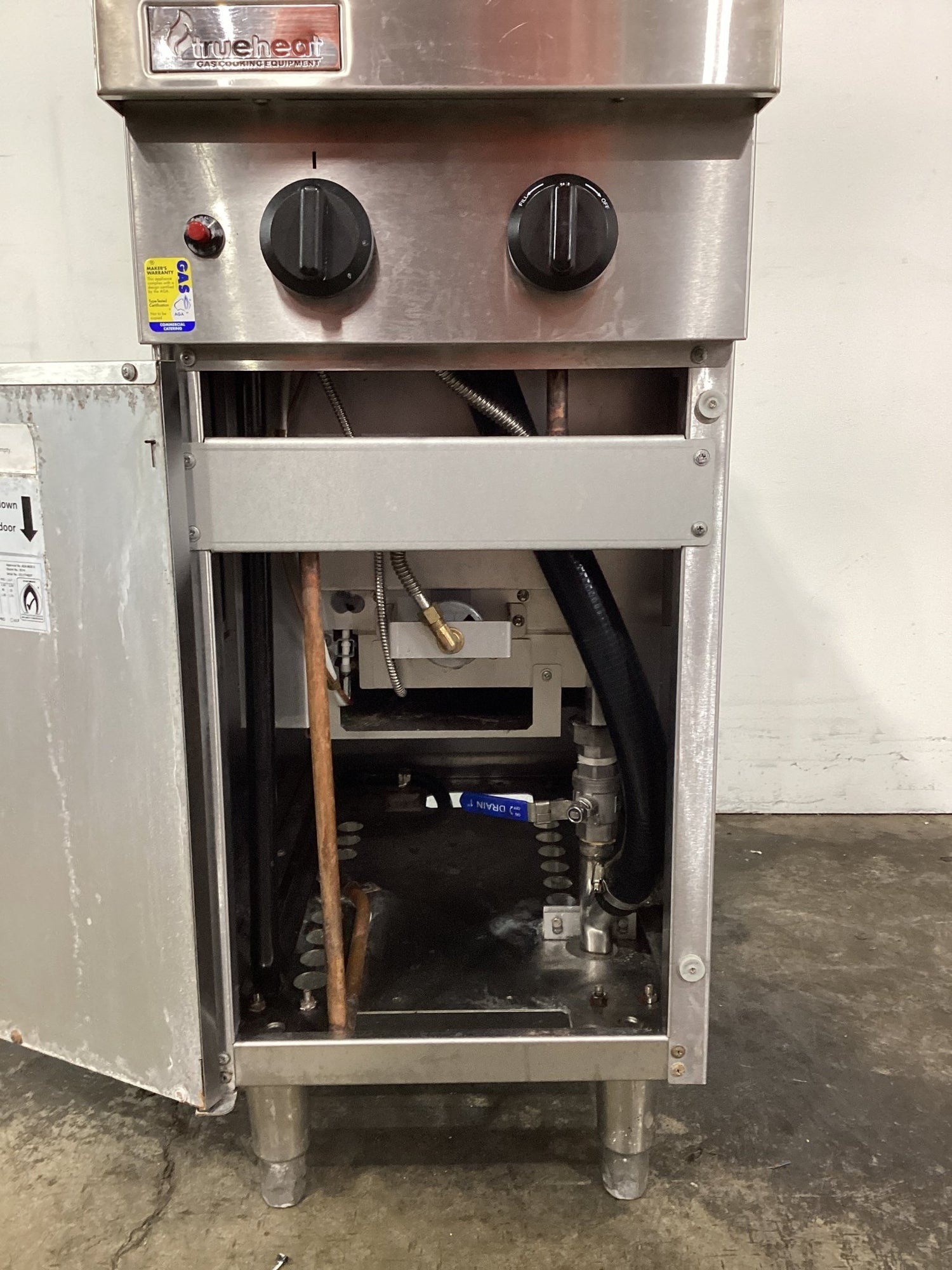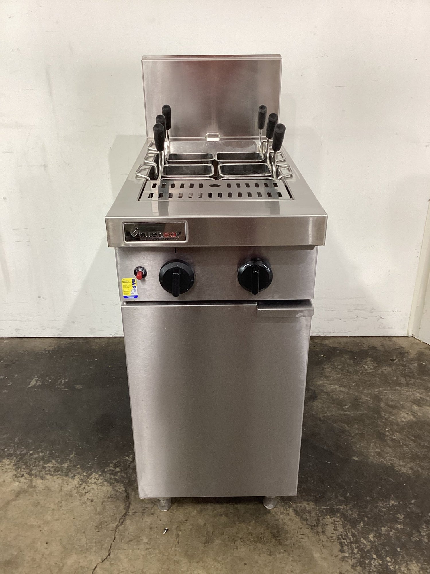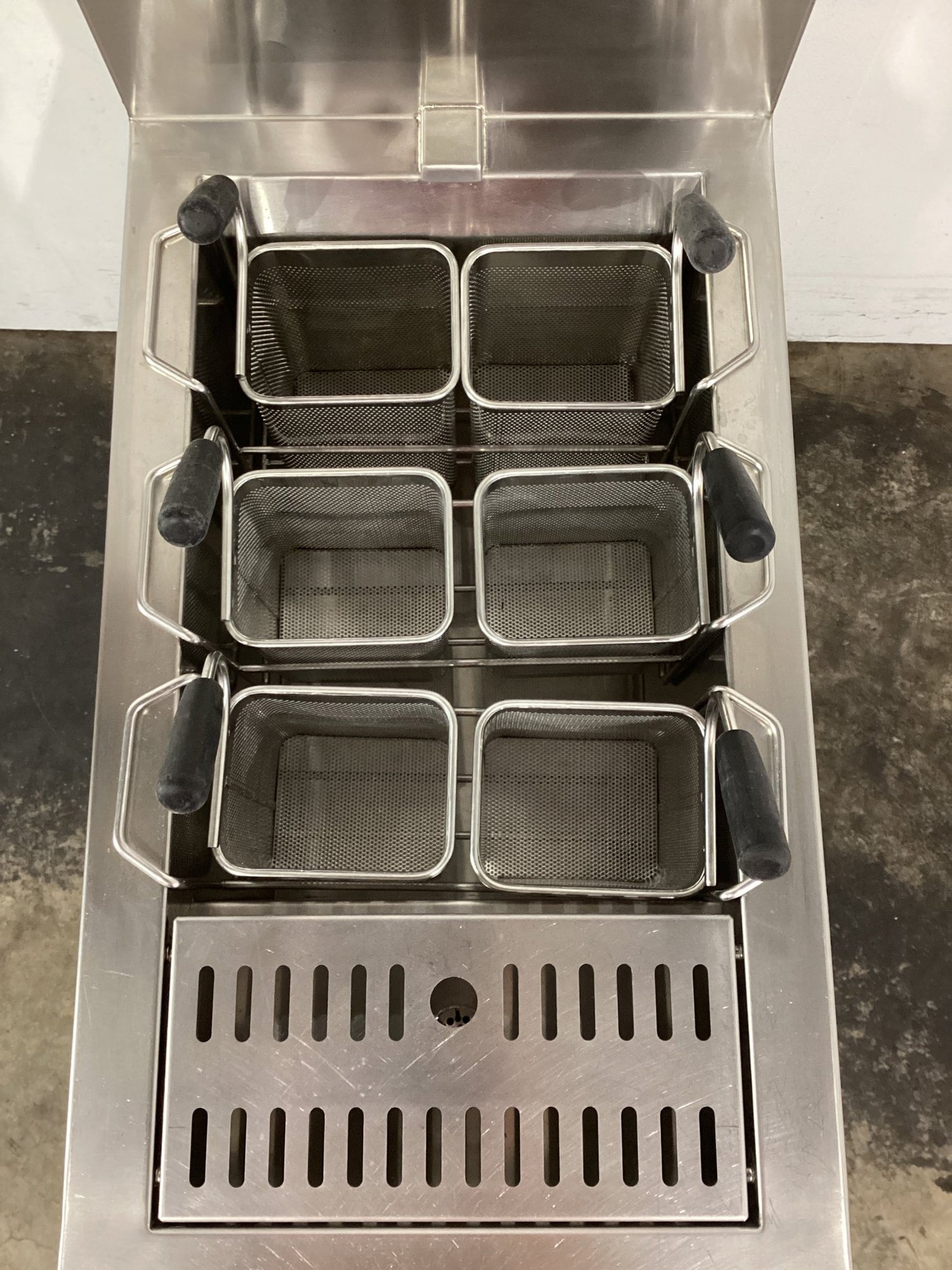 Pasta Cooker. Features 6 x Baskets, 35 litre capacity, Automatic skimming with overflow drain, Piezo ignition, Adjustable feet, Flame failure valve, S/S Finish, Scratches & Dents, 40Mj/hr, Millivolt Control, L.P.G,400mmW x 800mmD x 1140mmH, 71KG