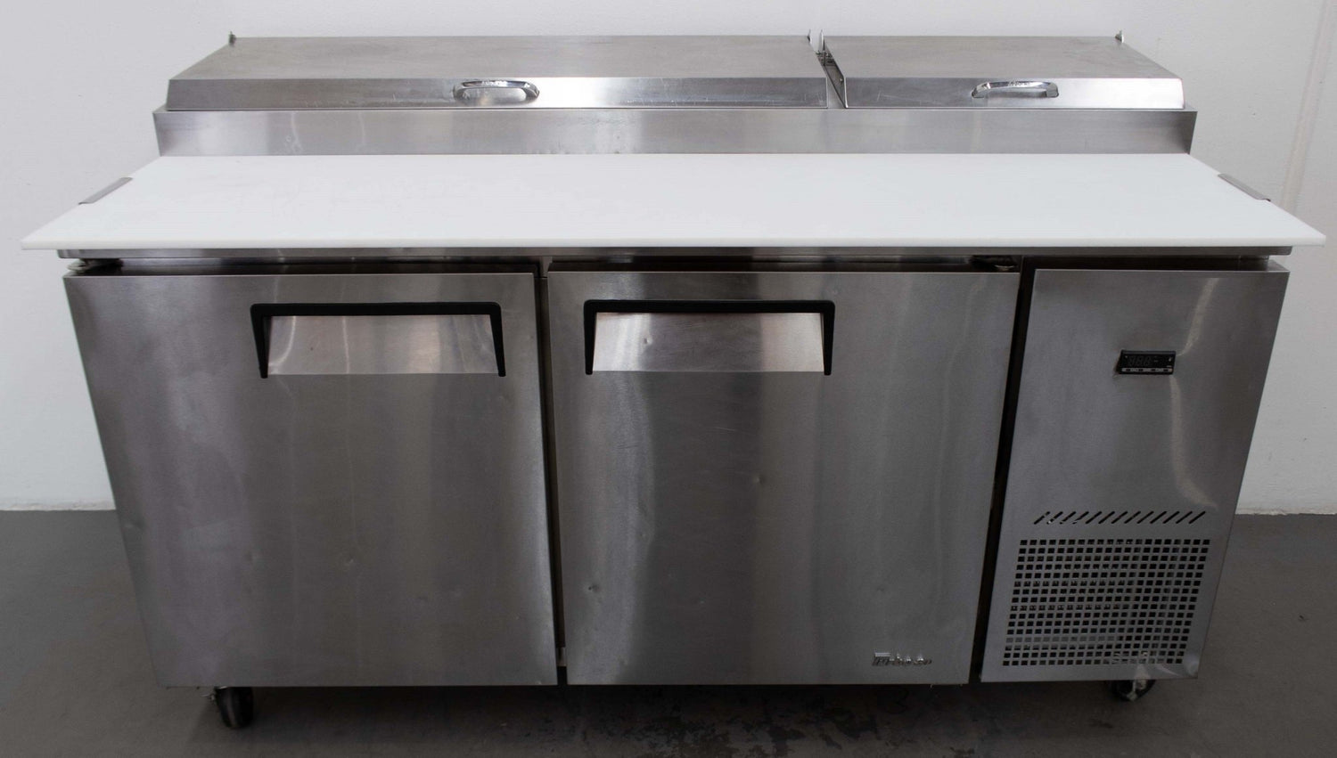 Pizza Prep Fridge. Features 566l capacity, Stainless steel lift up lids, 2 solid door chiller, 4 shelves, 18 X 1/6 GN Pans, Temperature range 1-5c, Bench with cutting board, Castors, Climate class Normal, Stainless steel finish, Scratches, 1710mmW x 910mmD x 1090mmH, 187KG, 10 amp 1 phase